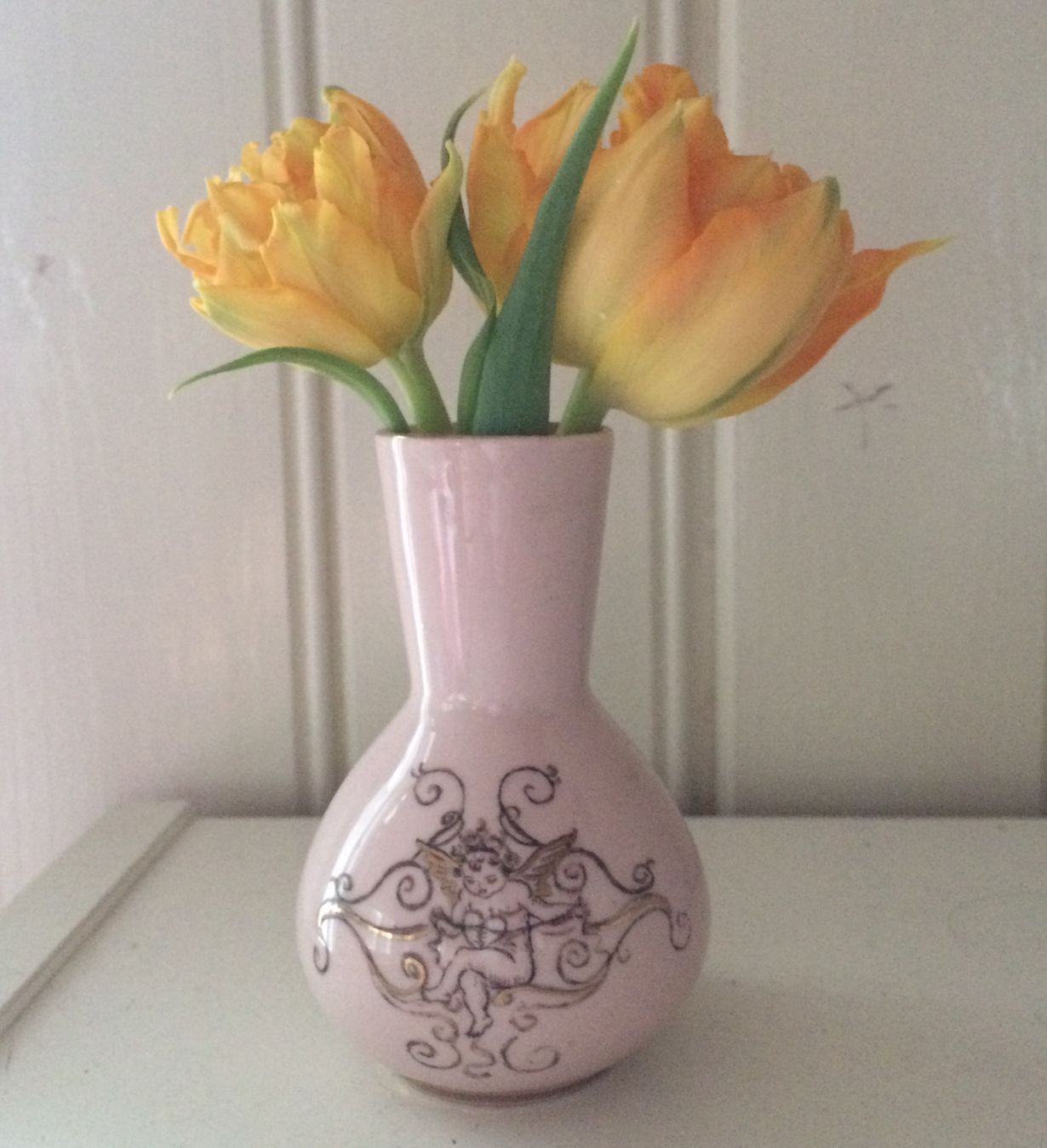 Tämä maljakko olen saanut äidiltäni. Äidin sisko, minun kummitätini, maalasi maljakon käsin, ja antoi sen lahjaksi äidilleni 50-luvulla.