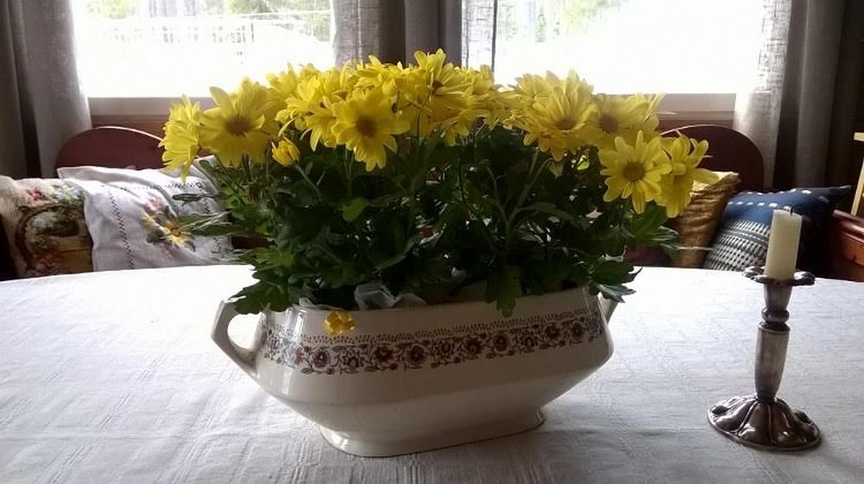 Laitoin kukat vanhaan Arabian soppakulhoon. Perintökulho on ollut kaapin päällä koristeena. Se on niin hieno, etten ole keksinyt sille käyttöä. Monta mustikkasoppaa siitä on vuosien varrella kauhottu, on sen verran pinttynyt. Pohjassa on vuosiluku 1920.