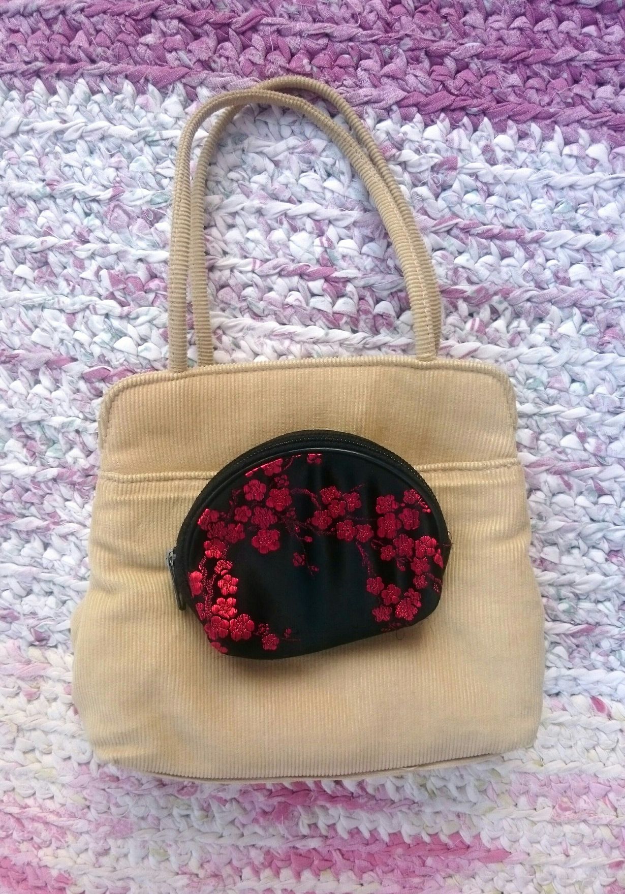 Pieni kukallinen vetoketju kukkaro on kolikoille. Käsilaukussa ovat vetoketjutaskut seteleille ja korteille. Kukkaro on aikoinaan hankittu tätä käsilaukkua varten, kun ei vanha suurikokoinen lompakkoni siihen mahtunut.