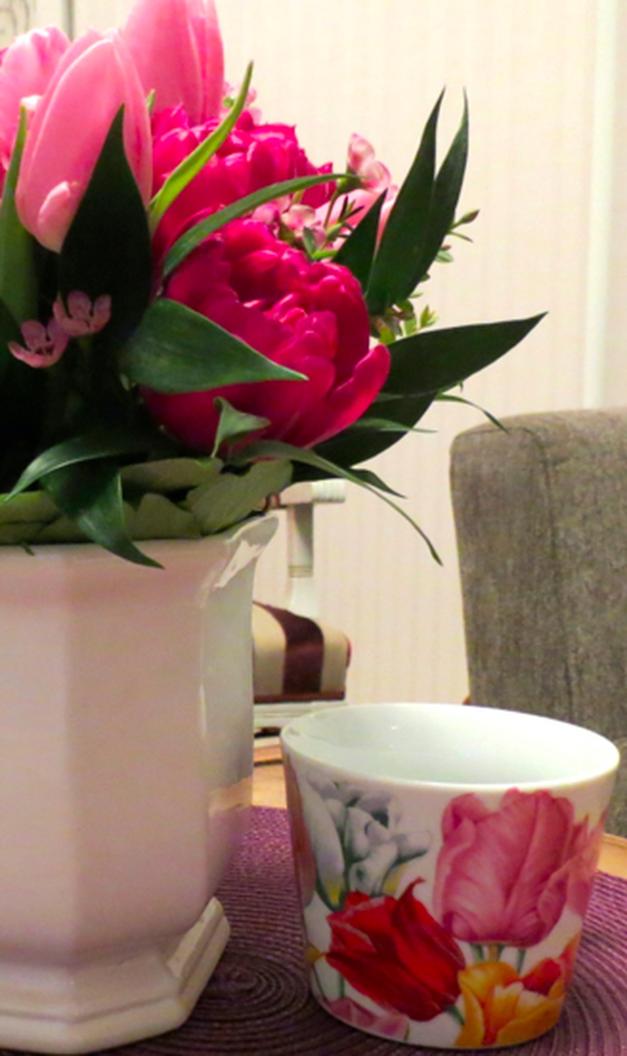 Tyttäreni, joka on asunut vuosia ulkomailla, lähetti kauniin kukkakimpun syntymäpäivänäni. Suureksi ilokseni löysin samana päivänä kukkakimpusta muistuttavan kahvikupin.