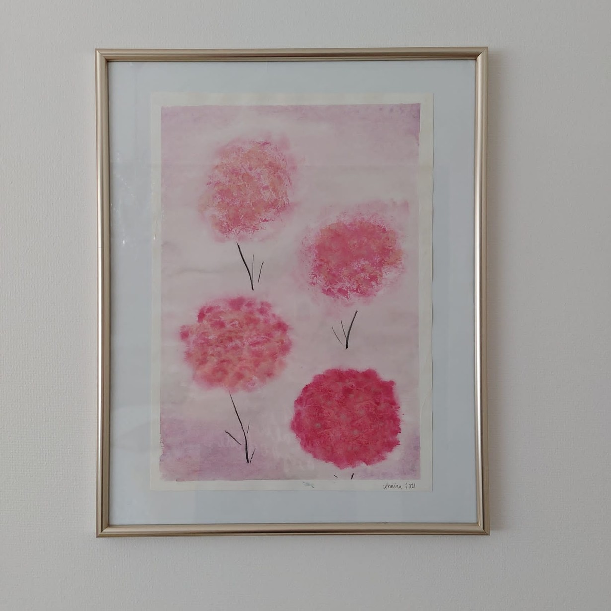 Maalasin tämän taideteoksen ajatuksena Kukkia äidille, mutta taulun annettuani kuulin ilahtuneen kommentin: "Hienoja koronapalleroita olet osannut maalata, lapseni". Olkoon tämä nyt sitten muisto koronavuodesta 2021.