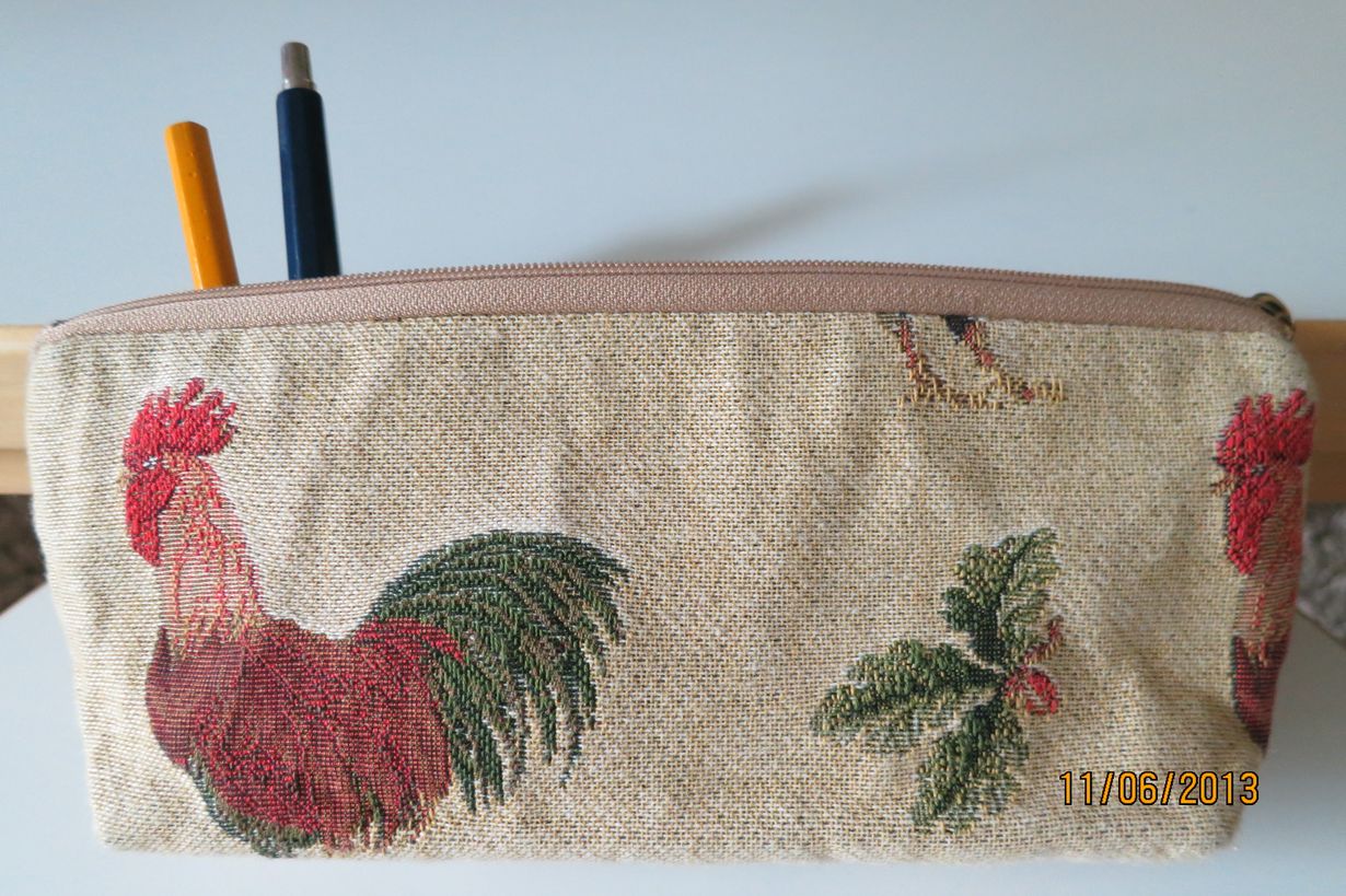 Ostin tämän hurmaavan gobeliinikankaisen kukkopenaalin Hietsun kirpputorilta vuosia sitten ja sen jälkeen se on matkannut kanssani ulkomaille lukemattomia kertoja sisällään ristikon täyttämiseen tarvittava rekvisiitta eli lyijykynä, kumi ja terotin, joka on ehdottoman tärkeä, koska haluan kirjoittaa vain terävällä kynällä. Varalla on myös kuulakärkikynä.