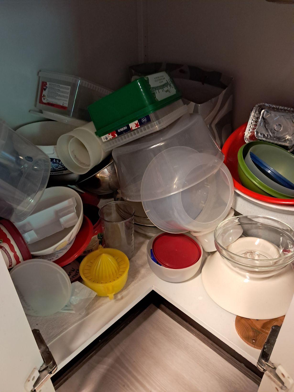 Pakasterasioita, kakkukupuja, lasikulhoja ym. Kaikki mitä "käsistä" pitää saada piiloon. Hylly on vaikea siivota kun on niin syvä ja lattiantasossa. Todella epäkäytännöllinen tila.