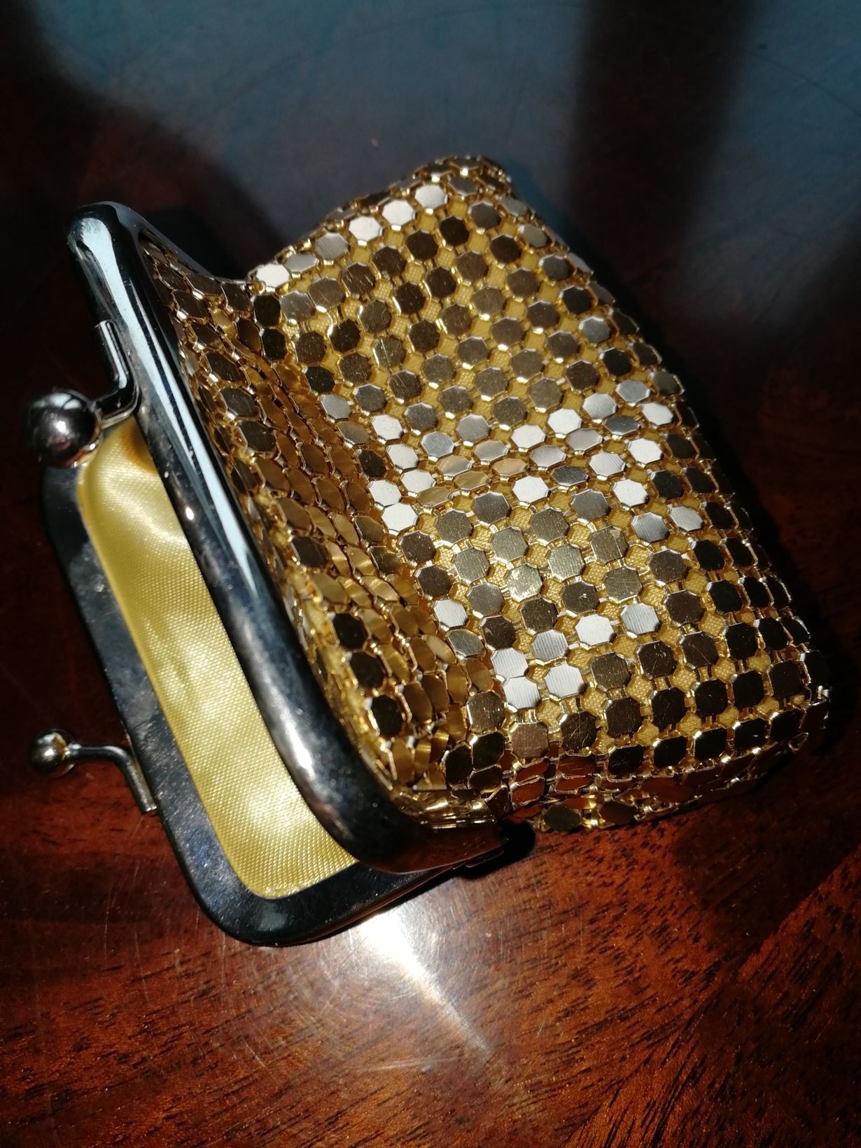 Kullanväristä metallia ja kaunis keltainen sisävuori. Kirppislöytö.