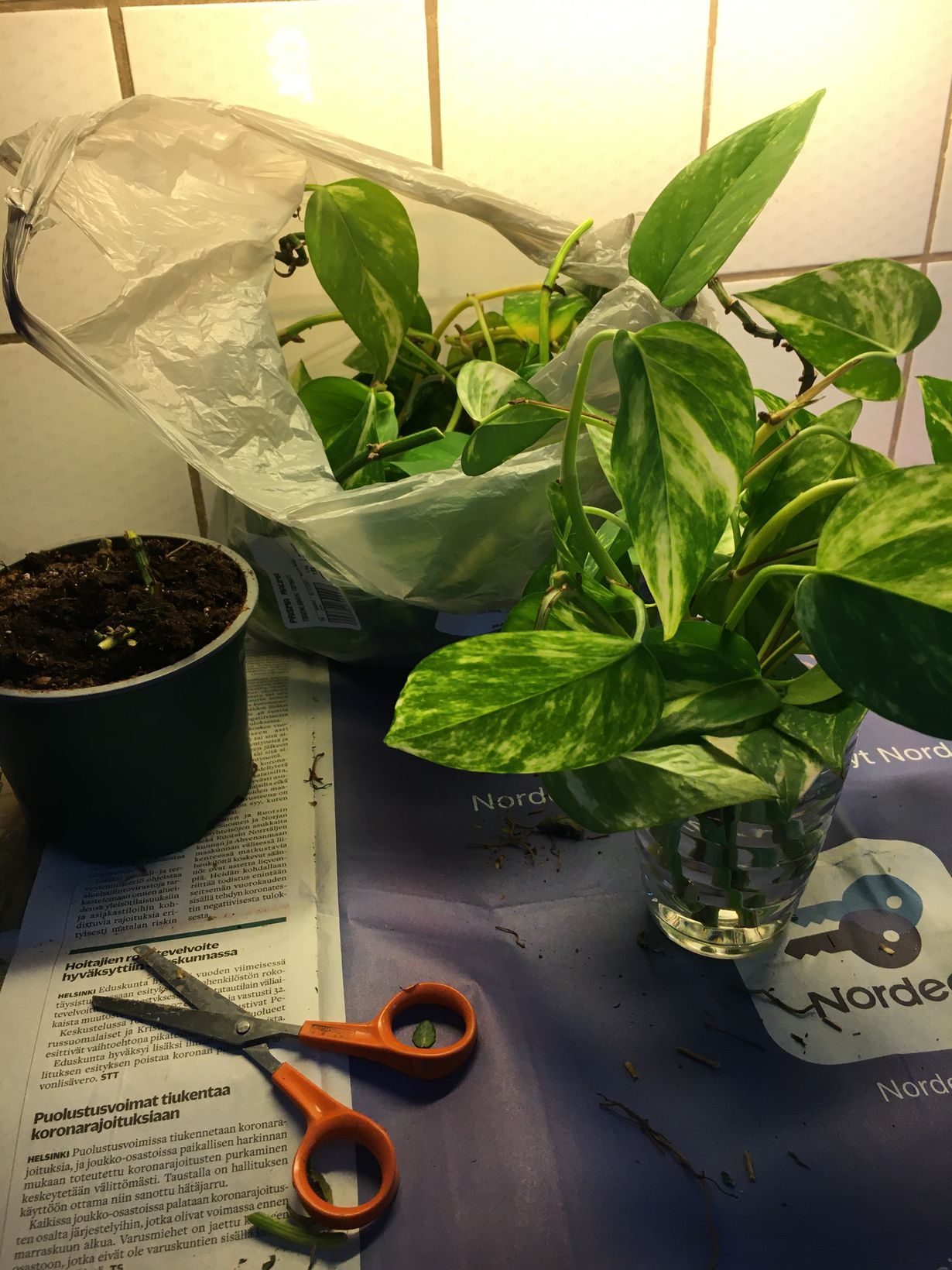 Vuosia vanha kultaköynnökseni on usein saanut antaa pistokkaita. Nyt tuli se päivä jolloin piti koko kasvi leikata alas. Uudet pistokkaat odottamaan juurtumista ja näyttää että myös vanhasta purkista joku sitkeä yrittää ylös. Pitää antaa vielä sillekin mahdollisuus.