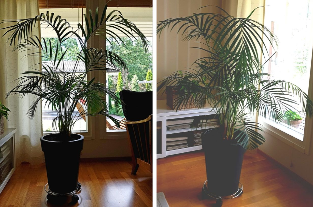Ostinkohan tämän KULTAPALMUn 2017 tai 2018. Kun en löytänyt mieleistä altakasteluruukkua tein tähän ruukkuun salaojituksen reilulla kerroksella lecasoraa, jonka päälle leikkasin juurikangasta. Sitten vasta lisäsin altakastelumultaa johon istutin ison viherkasvin. Hyvin on viihtynyt.