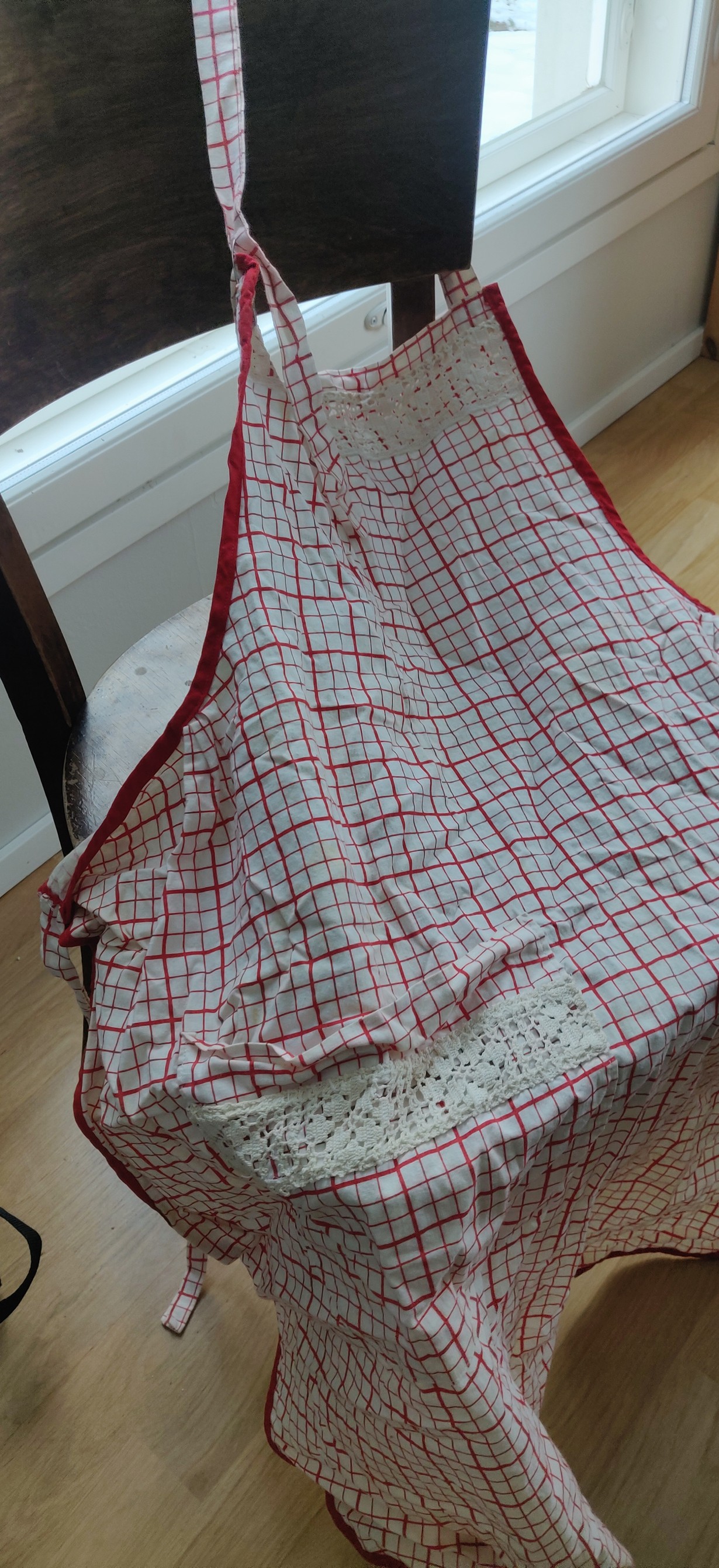 Vanha essu, jonka jo edesmennyt kummitätini on ommellut ja virkannut pitsit. Tunnearvoa valtavasti tällä likaisella ja kurttuisella essulla <3