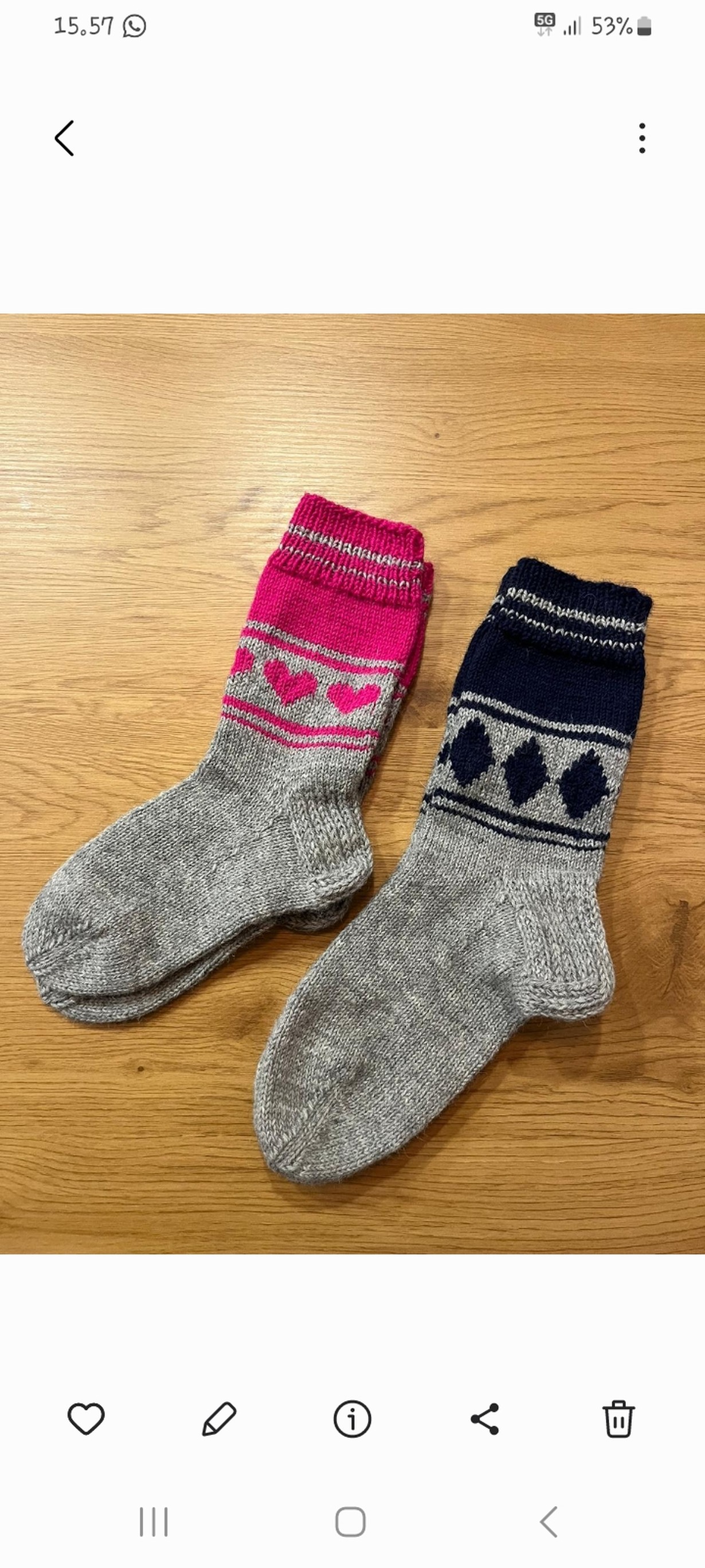 7veljestä langasta kudotut "jussi- ja jussitar-sukat" kummitytölle ja hänen puolisolleen tuparilahjaksi.