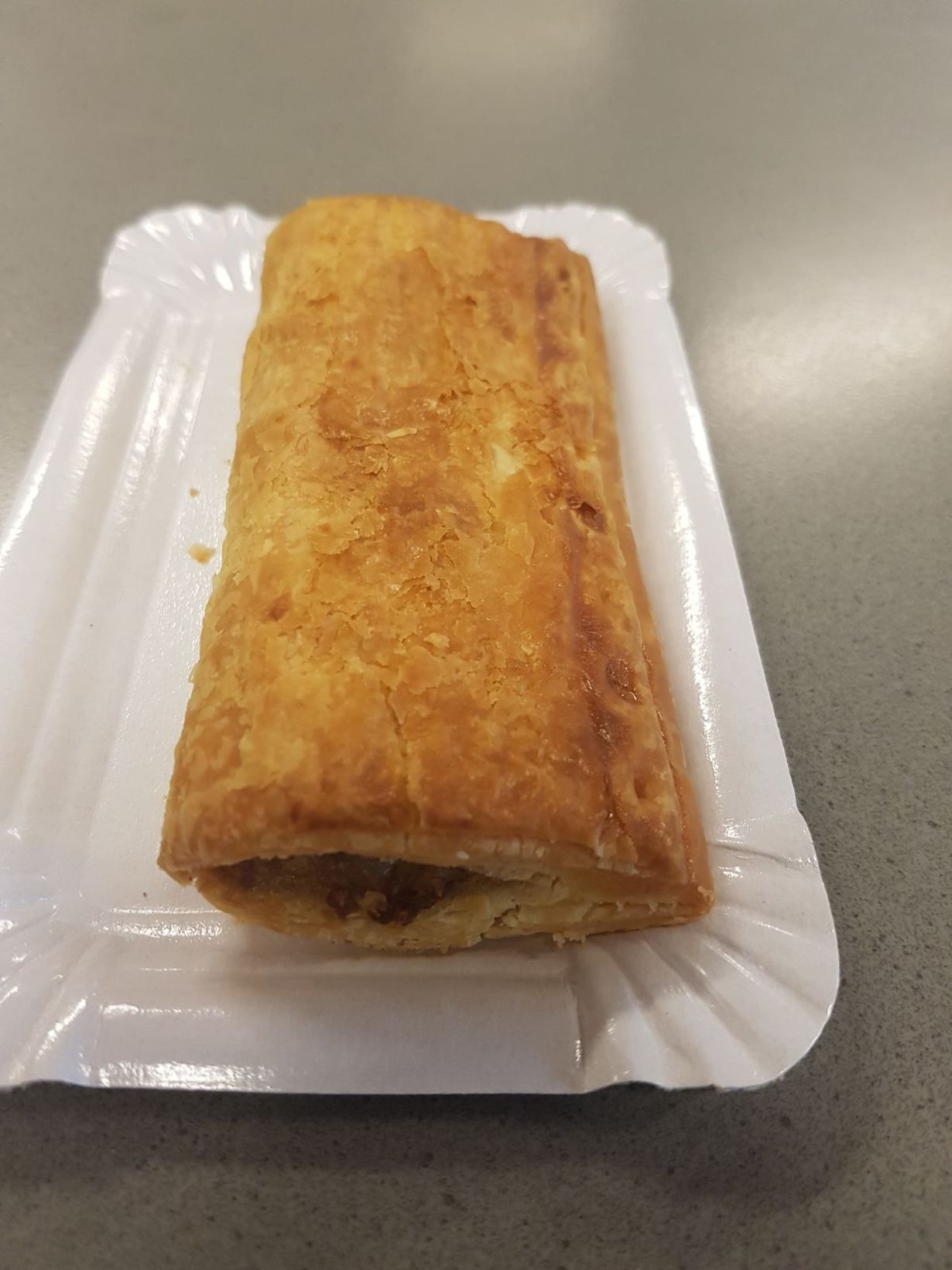 Lihapiirakka, tuoreena ja lehtevänä paikallisleipomosta. Joka päivä kello kymmenen tulee uunista ulos ja hyllyyn, siitä saa energiaa nälkäiset työmiehet taas!