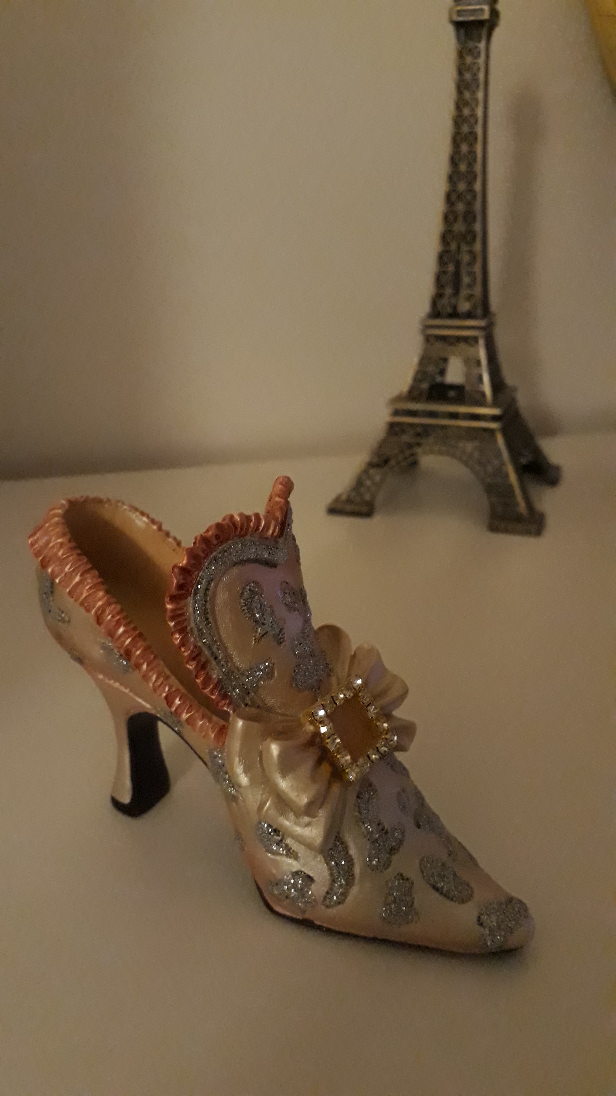 Tämä ihana pikku jalkine on matkamuisto Versailles'n palatsista, jossa vierailin 50-v päivän kunniaksi. Ei siis kovin kaukaa, mutta "kerran elämässä" matkalta.