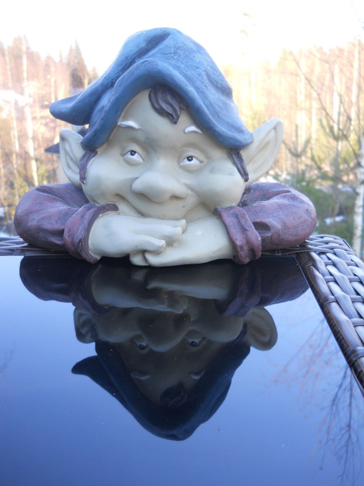Tämä ihana arki: puutarhakoriste "Kuokkavieras terassilla" 22.4.2012 klo 19:01 Reunaan nojaava tonttu kulkee paikasta toiseen pihallamme ja yllättää milloin missä.