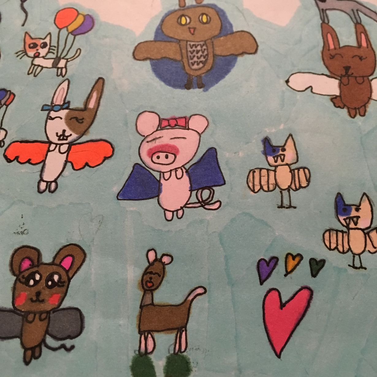 Kaksi vuotta sitten ostin tytöilleni kunnon tussit ja hiihtoloma kului ensin ulkoillessa ja sitten piirrellessä. Kuopus 8-vee täytti A3-paperin pienillä hahmoilla, tässä vain pieni osa siitä. Moni totesi, että siitä tulisi kiva kuosi lastenkankaaseen.