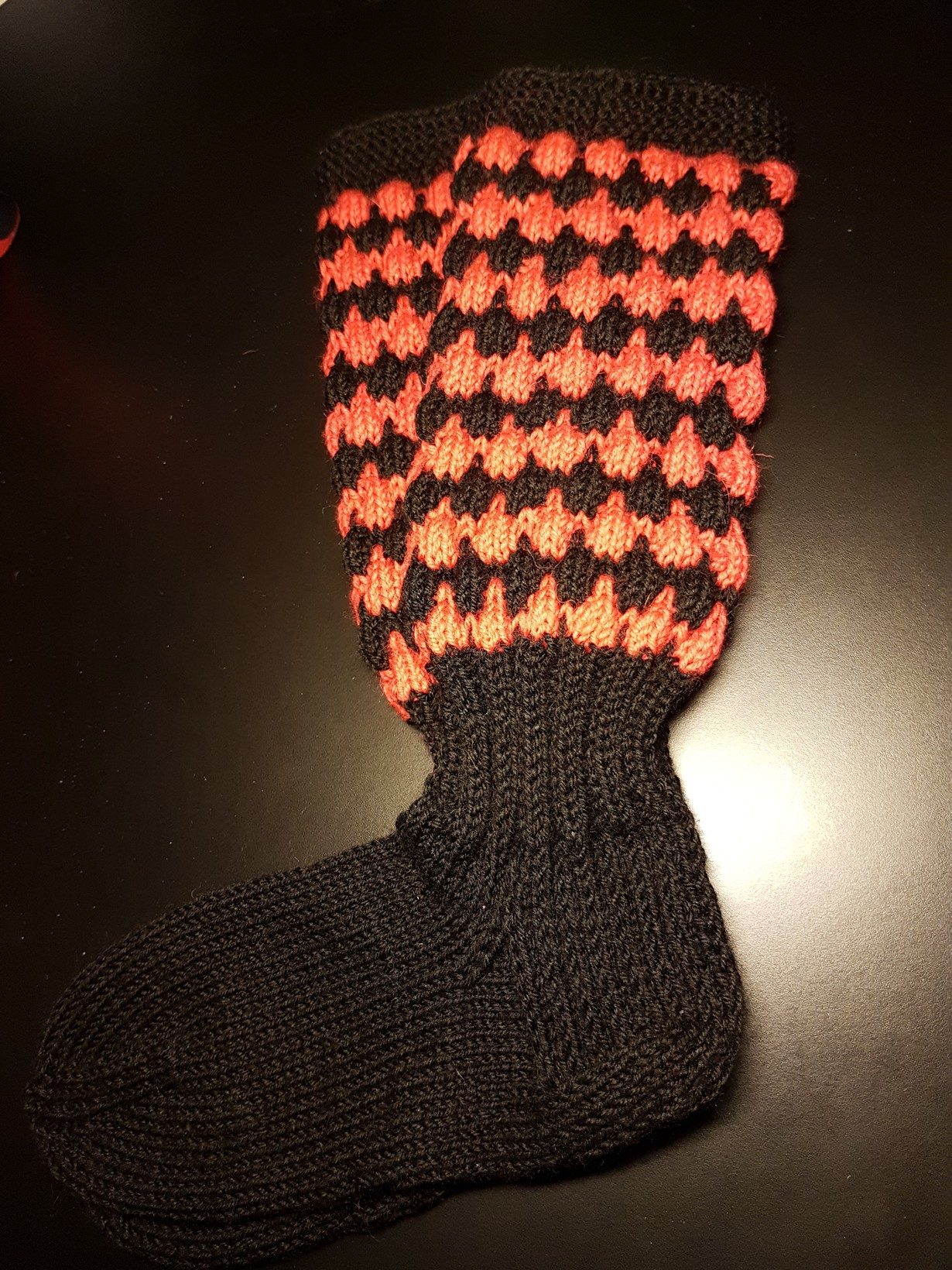 Vanhempani ovat Karjalasta ja olen käynyt Ruskealassa useita kertoja ja myöskin muualla Karjalaa. Sukkia kudon paljon viidelle lastenlapsilleni sekä aikuisille. Halusin tehdä Karjalan väreillä ja kuplaneulos sopi tähän hyvin. Punainen näyttää kuvassa oranssilta, mutta on punaista, ei kuitenkaan täysin kirkas punainen