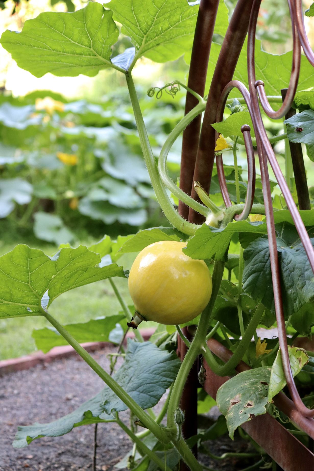 Lähetä kuvakisaan kuva itsekasvattamastasi vihanneksesta - voita Familonin vartalotyyny Kurpitsaa ja romurautaa @weeran_puutarhassa 21.7.2023 klo 7:55 Jättikurpitsa sai ympärilleen kehikon vanhasta metallisängyn rungosta.