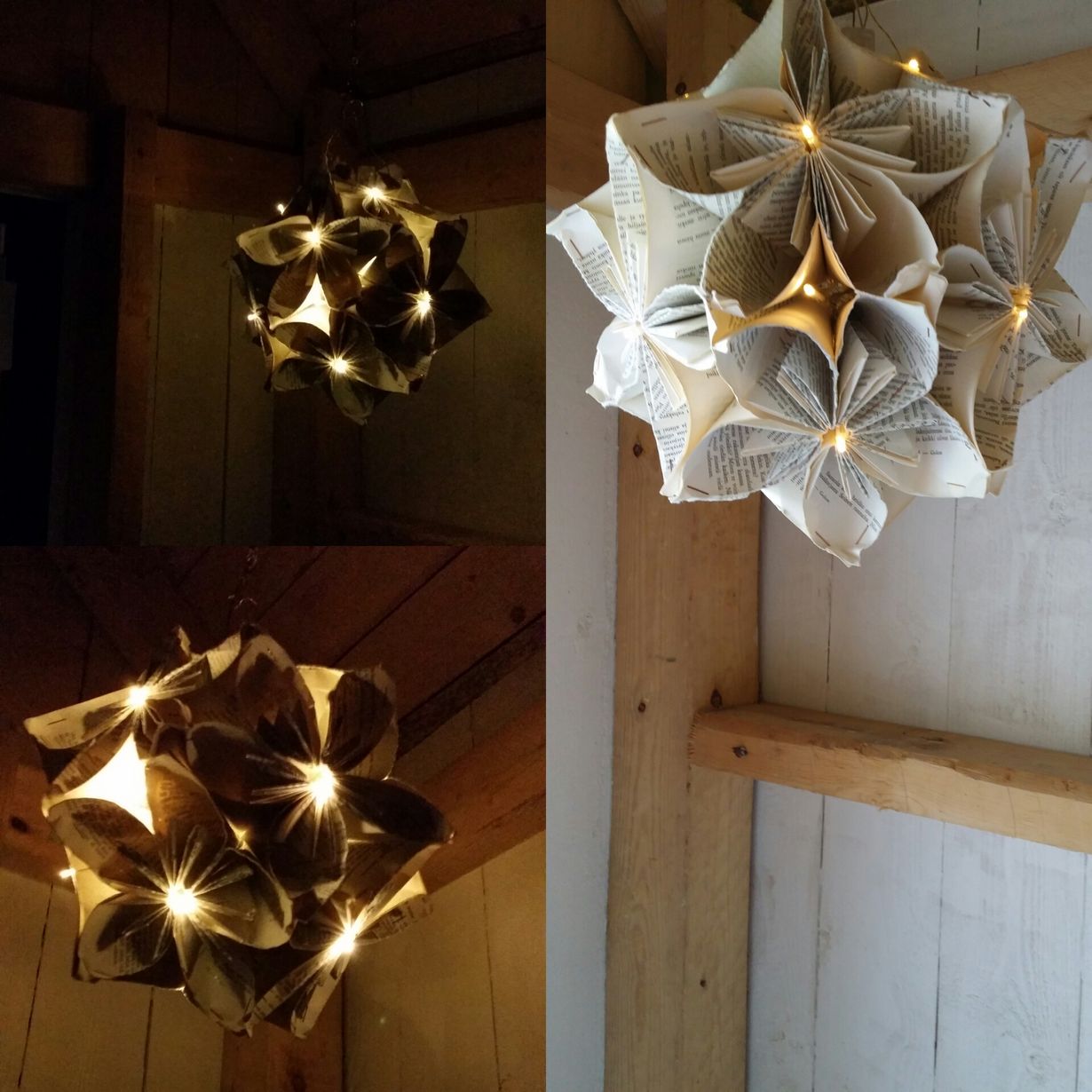 Vanhan kirpputorilta löytämäni kirja muovautui kukan muotoon. Kusudama origami tuo valoa ja tunnelmaa joulun odotukseen sekä syksyn pimeneviin iltoihin. Kukan sisällä on patterilla toimivat jouluvalot. Kukan terälehtien taitteleminen on melko aikaa vievää puuhaa, mutta lopputulos on mielestäni todella palkitseva ja kaunis. Halpa ja ekologinen joulukoriste!