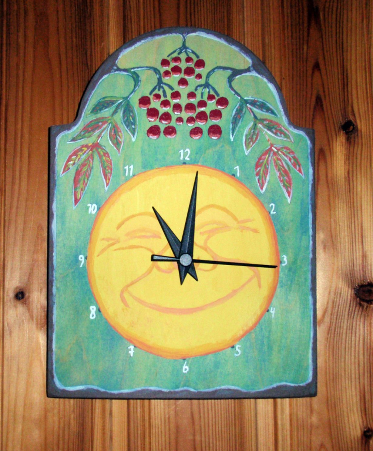 Kuukelloni kyhäsin itse vaikeassa elämäntilanteessani 5.10.1997 kun olin juuri eronnut ja muuttanut yksin asumaan. Rahaa ei ollut paljon mihinkään, elämäni oli sekaisin ja lapsetkin jäivät asumaan isänsä luokse. Olo tuntui aivan kamalalta. Ostin Sinooperista puisen kellotaulun ja koneiston. Maalasin kellotaulun jonka halusin piristävän arkeani. Kello on palvellut hyvin, piristänyt ja ihastuttanut muitakin. Mitään tyylikästähän siinä ei ole, mutta en siitä ole raaskinut luopuakaan. Vuosi sitten ostimme nykyisen mieheni kanssa kesämökin, jossa se on saanut kunniapaikan. Tänään 8.11. minusta tuli tuore mummu ja parin päivän päästä täytän 50. Se on paras lahja ikinä. Ensi kesänä pojanpoikanikin saa katsella nauravaa kuukelloa. Tällä hetkellä olen onnellisempi kuin koskaan.