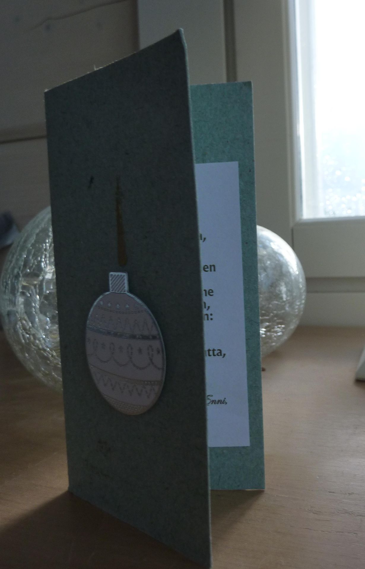 Kierrätyspaperista valmistetussa korttipohjassa on pehmeää rosoisuutta. Kortin sisäpuolelta löytyy runo, jossa muistellaan tuttuja tuoksuja kuusen ja maltaan.