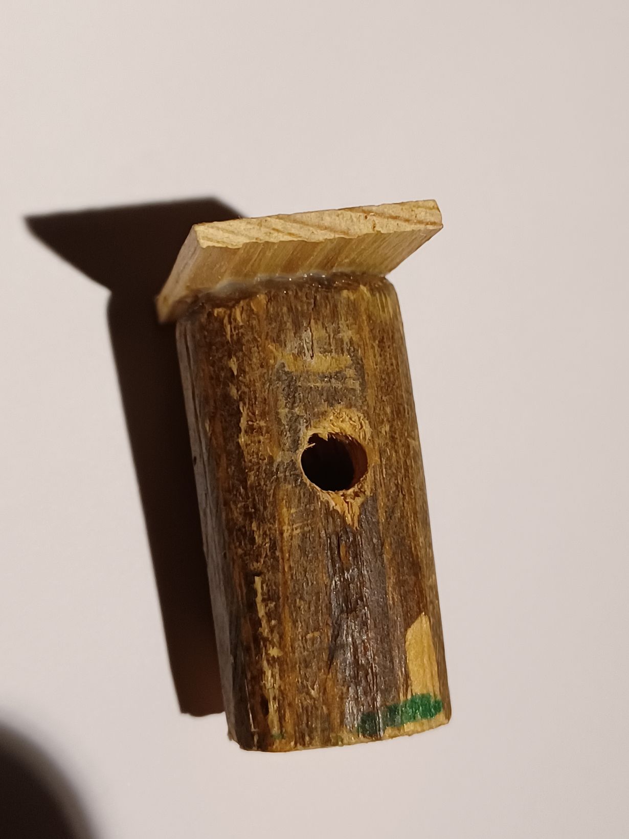 Poikani teki tämän minilinnunpöntön kymmenvuotiaana,sen korkeus on 4cm. Tämä pönttö on ollut joulukuusessamme siitä lähtien joka joulu,tuleva joulu on jo 34 kerta kun itse haluan sen laittaa kuusen runkoon nojaamaan.