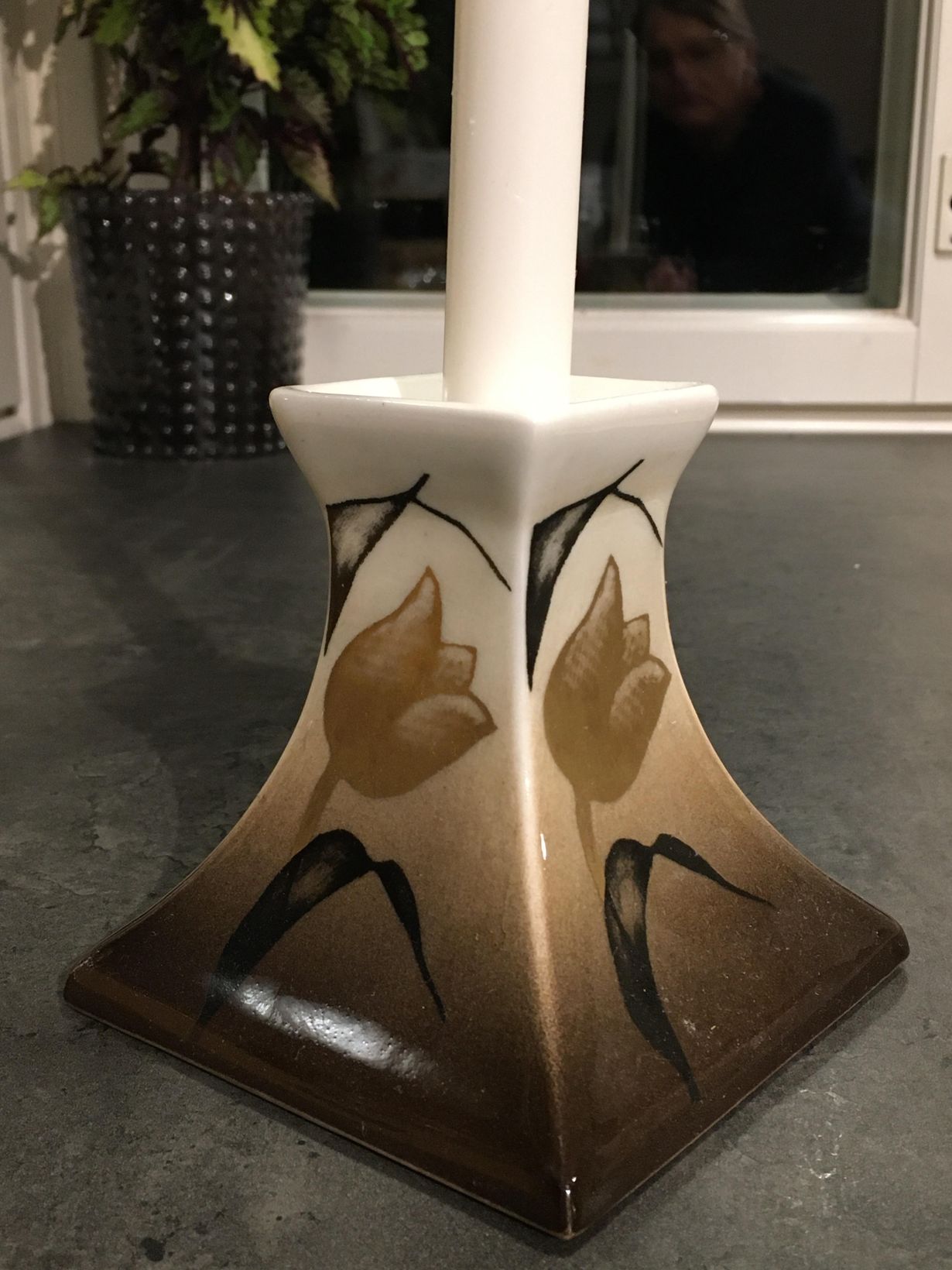 Hei. Kyseisen kynttiläjalan sain neljäkymmentä vuotta sitten kurssilaisiltani. Pidin kudonnankurssia kansalaisopistolla. Ilmeisesti opiskelijat olivat tyytyväisiä kurssin antiin, koska muistivat minua näin hienolla lahjalla. Tämä lämmittää vielä neljänkymmenen vuoden jälkeenkin. Kynttiläjalka on Heljä Liukko-Sundströmmin tuotantoa. Hän oli silloin kovasti pinnalla.