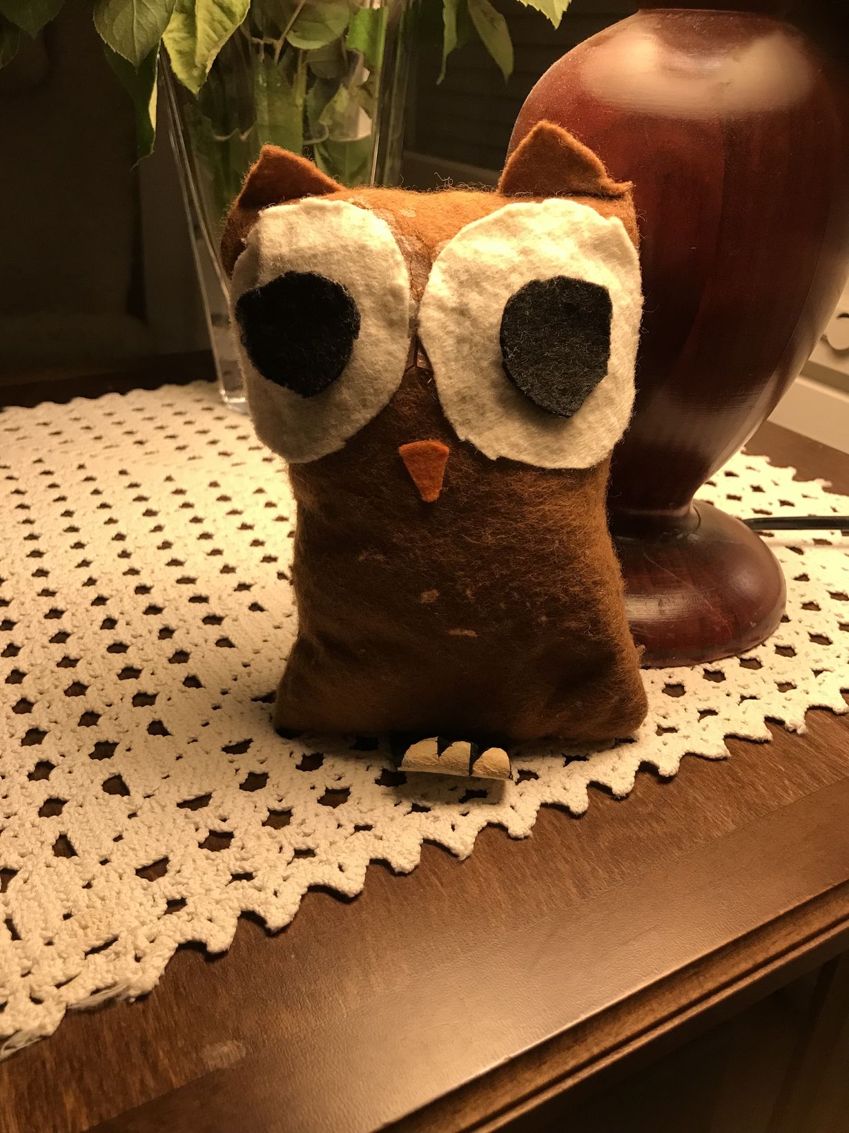 Poikani 8-vuotiaana tekemästä pöllöstä. Poikani kuoli tammikuussa 2013 tapaturmaisesti moottorikelkkaonnettomuudessa. Hän oli tuolloin täyttänyt juuri 38 vuotta. Tämä pöllö on hänen valmistamansa koulukäsityö ja muistan kuinka onnellisena hän toi sen kotiin. Häneltä jäi yksi poika, tuolloin 16-vuotias. Olen ajatellut pitää tuota pöllöä aarteenani niin pitkään, kunnes joskus jos pojanpojalleni syntyy oma lapsi, niin annan sen sitten vauvatuliaiseksi