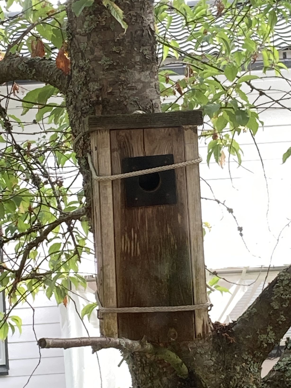 Kuvassa Kuopion kauppatorilta ostettu linnunpönttö keittiön ikkunamme edessä. Yhtä vanha kuin omakin kotimme on. Jokaisena kesänä olemme poikuetta saaneet seurata, useimpina kaksi. Tänä kesänä se keikahti poikasten ollessa pöntössä- siksi se on narulla kiireesti kiinnitetty ja oikaistu.