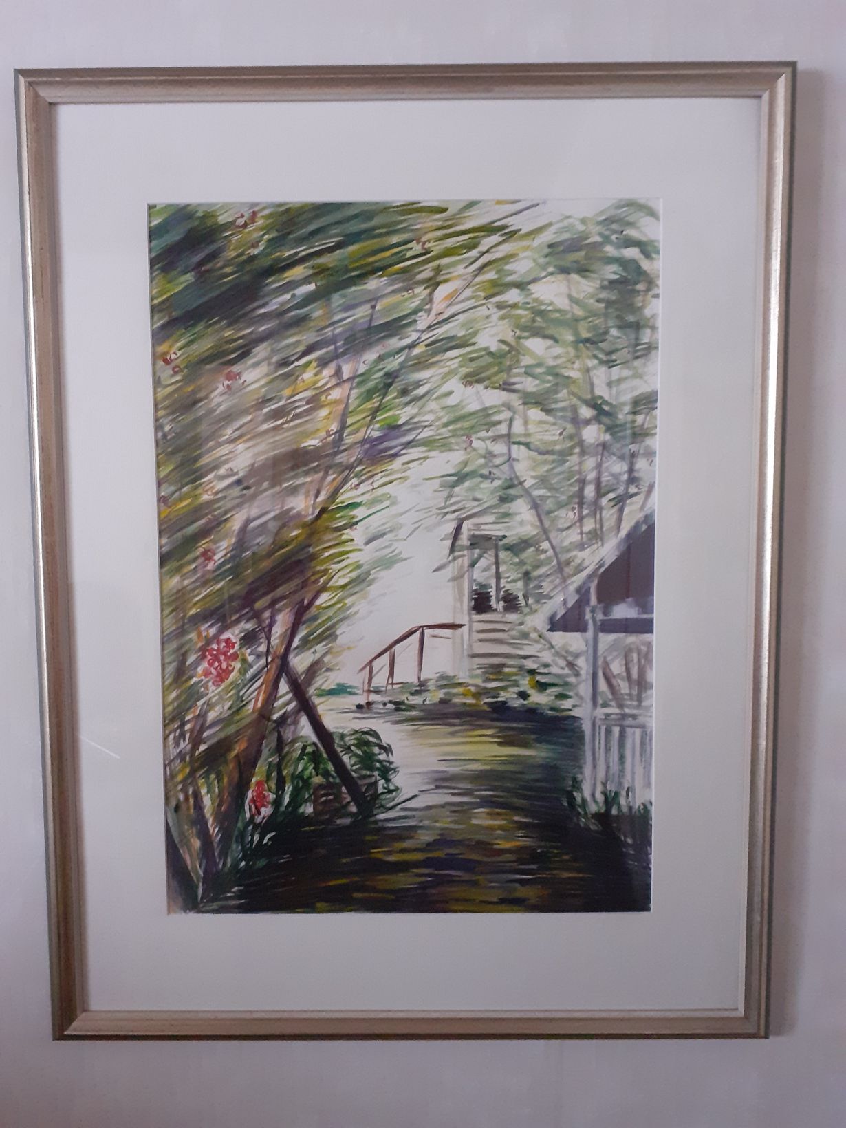 Mieheni sisarenpoika piirsi meillä lomaillessaan tämän taulun pihaltamme. Siinä pihlajanoksien lomasta näkyy talomme kuisti. Tämä taulu on olohuoneemme seinällä.