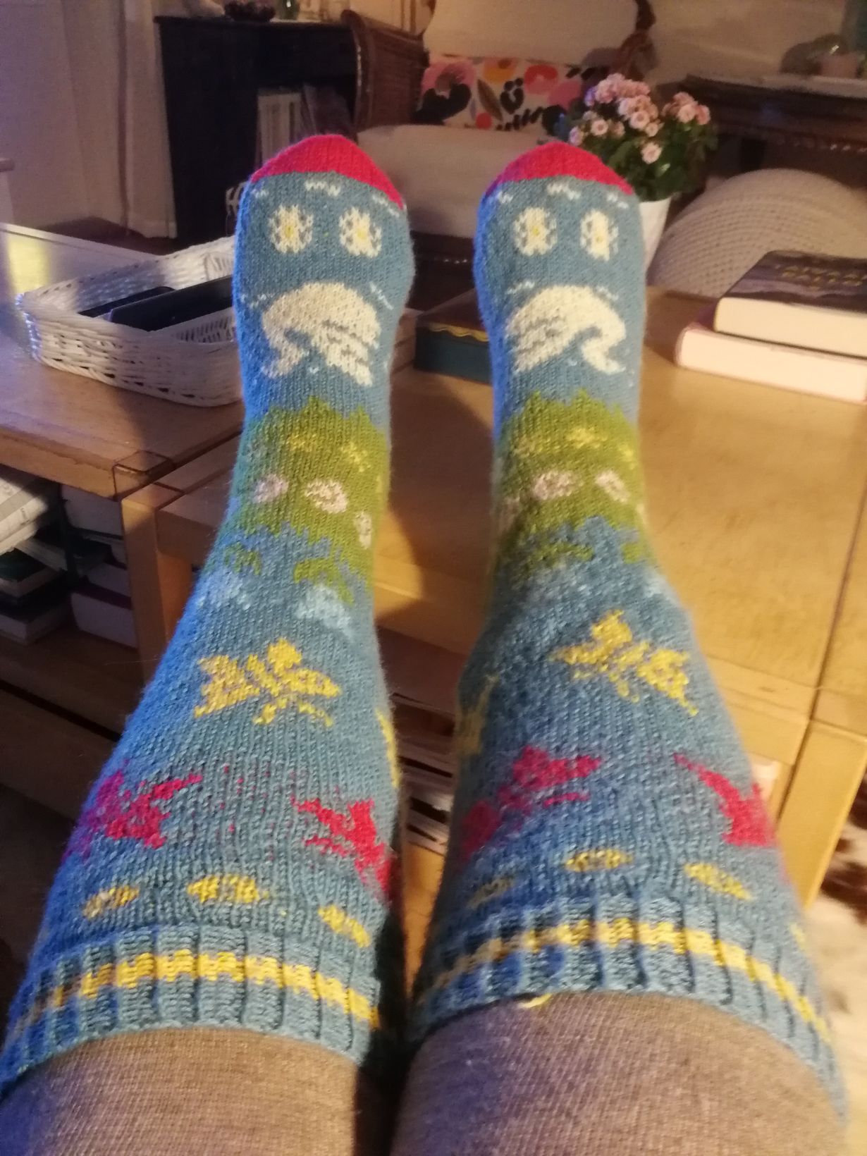 Kesän lämpöä. Sinitaivaalla liitävät perhoset, värikäs kukkaketo laskeutuu joutsenlampeen, jossa kelluvat lumpeenkukat. Sekä kopioituja että omia kuvioita. Villalanka, puikot 2,5.