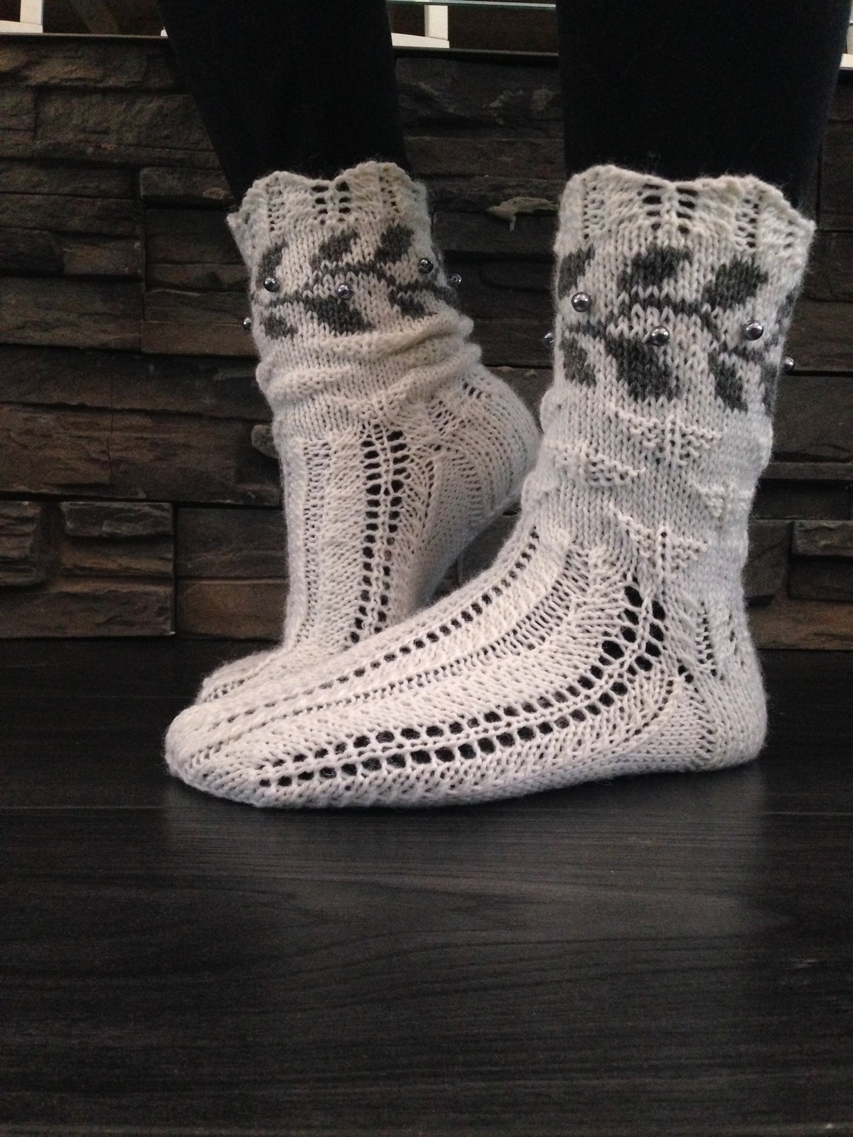 Downton abbey sarjan innoittamana suunnittelin ja tein morsiammelle villasukat. Sukissa on häätiara joka kiertää sukkien yläosaa ja samantyyppinen oli sarjan Mary-leidillä. Sukat on nimeltään Leidi.