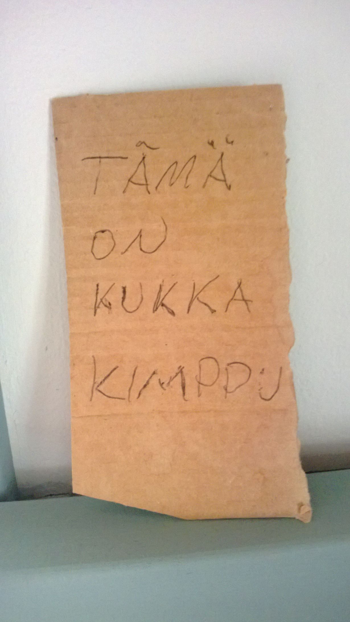 Mieheni tuli eräs ystävänpäivä kotiin tuon pahvin palasen kanssa. Hänellä ei ole todellakaan tapana tuoda kukkia kotiin, mutta tuona päivänä hän oli ajatellut ja käynyt kukkakaupassa. Mutta jonot oli olleen kuulemma liian pitkät ja oli mennyt hermot jonottaessa. Sain pahvin palan, joka on koristanut keittiötämme jo kohta 10 vuotta!
