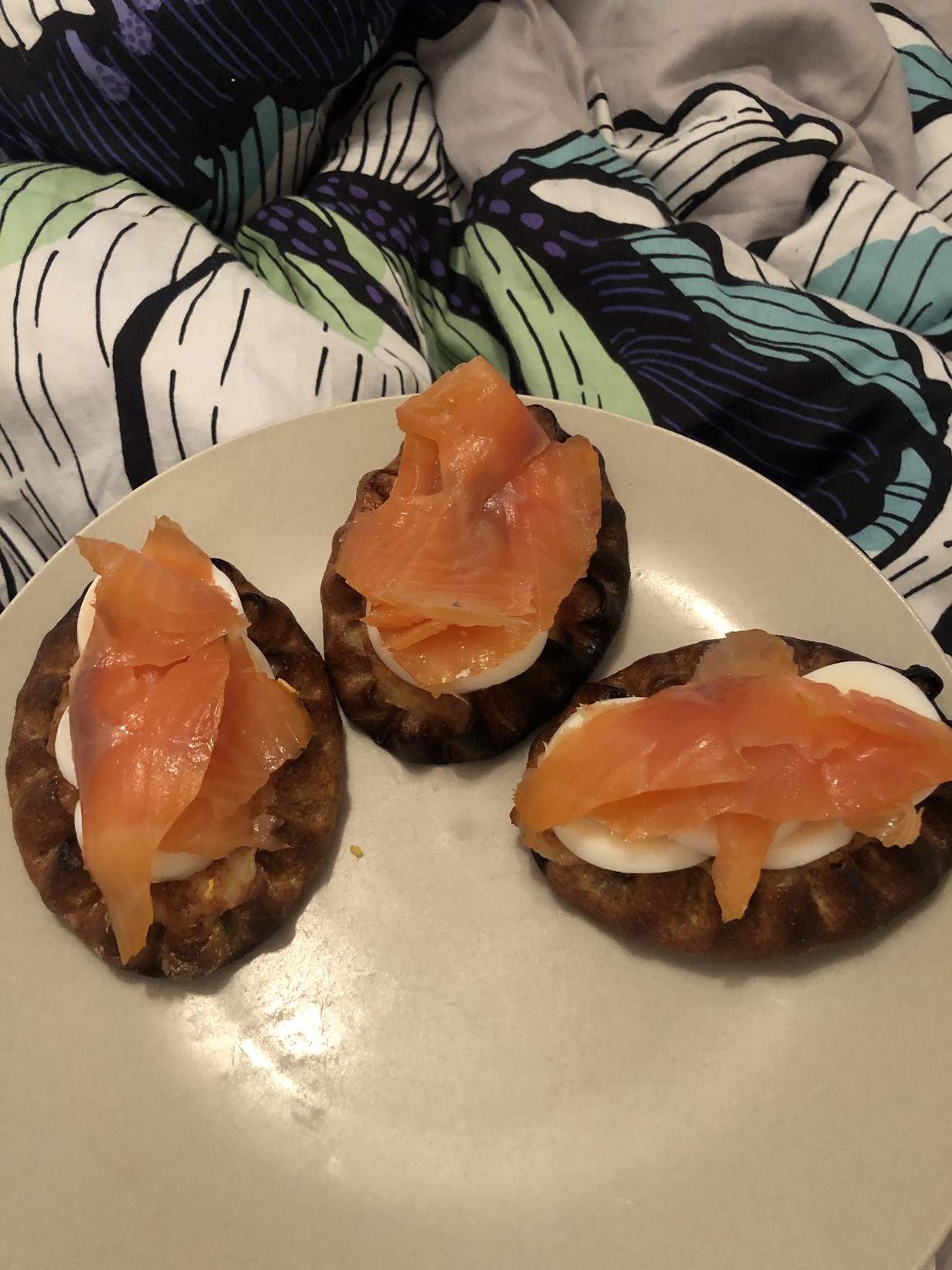 Näin Joulun alla välipalana oli riisipiirkoita joiden päällä levite, kananmuna ja työkaverin itse kylmäsavustamaa lohta. Ai että kylläpä oli hyvää.. Jouluna myös suuri herkku kinkku ja riisipiirakka toimii myös todella hyvin kun laittaa sinappia päälle.