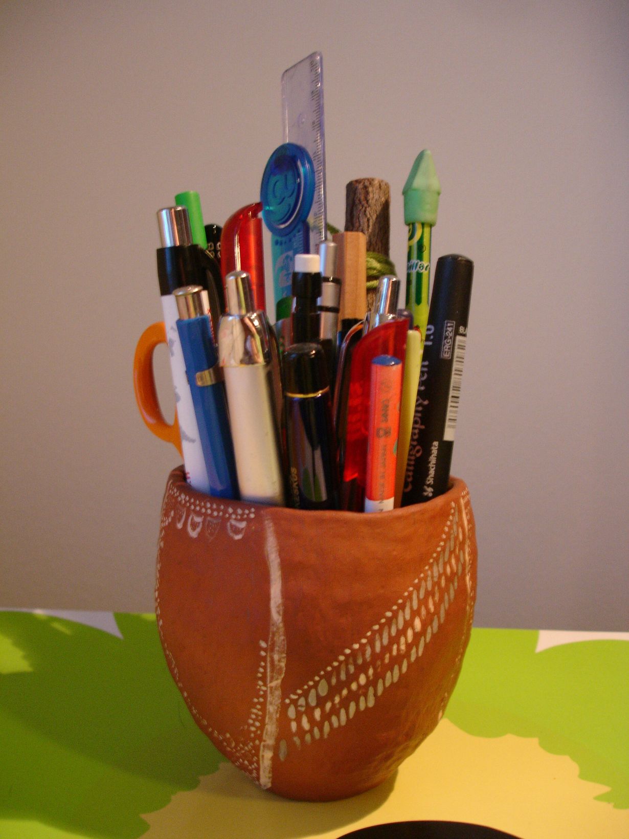 Olin.n. 30v. sitten arkeologisilla kaivauksilla ja siitä innnostuneena tein kansalaisopistossa omia ruukkuja. Kynätelineen virkaa hoitava on yksi ensimmäisistä ruukuistani.