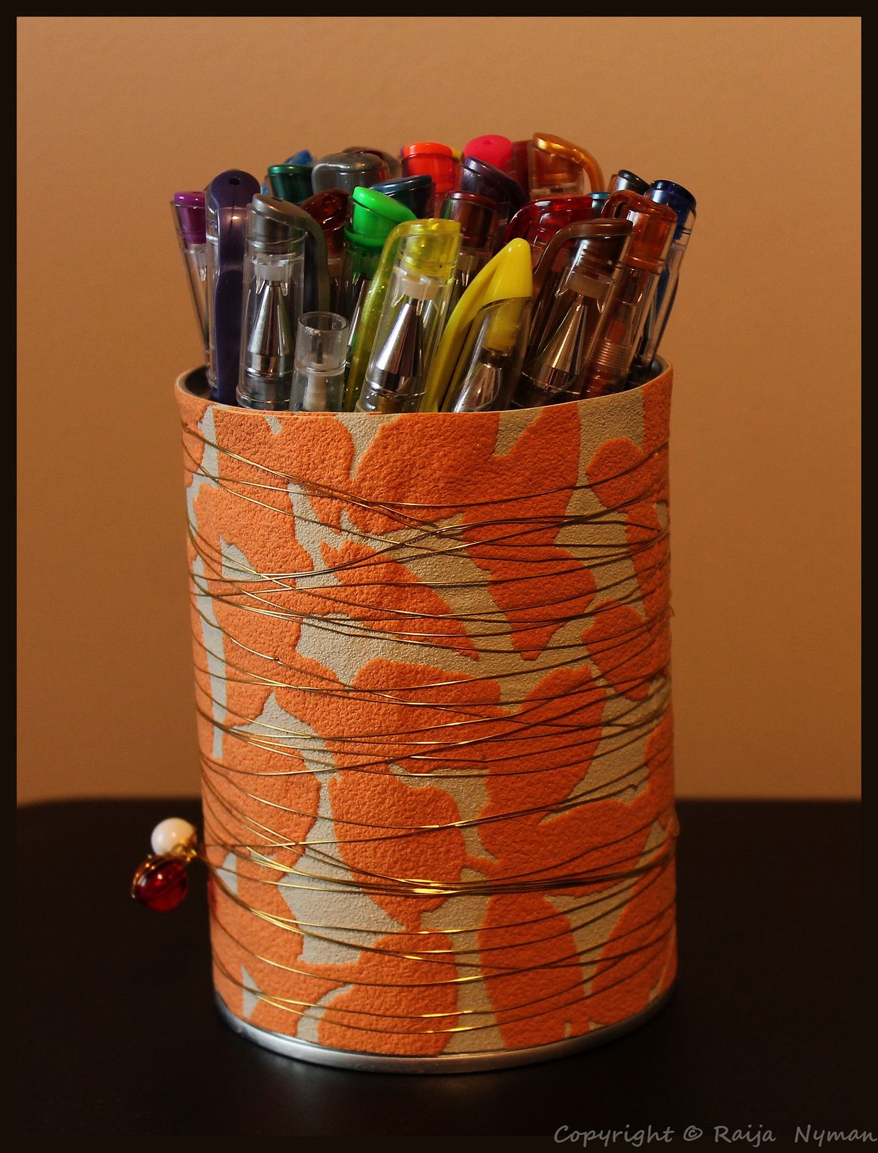 Minulla on monia kynätelineitä, kaikki itse tuunattuja esim. ananaspurkeista tai vastaavista. Toisiin olen laittanut esimerkiksi ylijäämä tapettia kuten tähän lähettämääni..Egologista käyttöä, ei tarvitse ostaa ja on vieläpä hauskan näköisiä ja kevyitä. Ei hajoa edes pudotessaan .