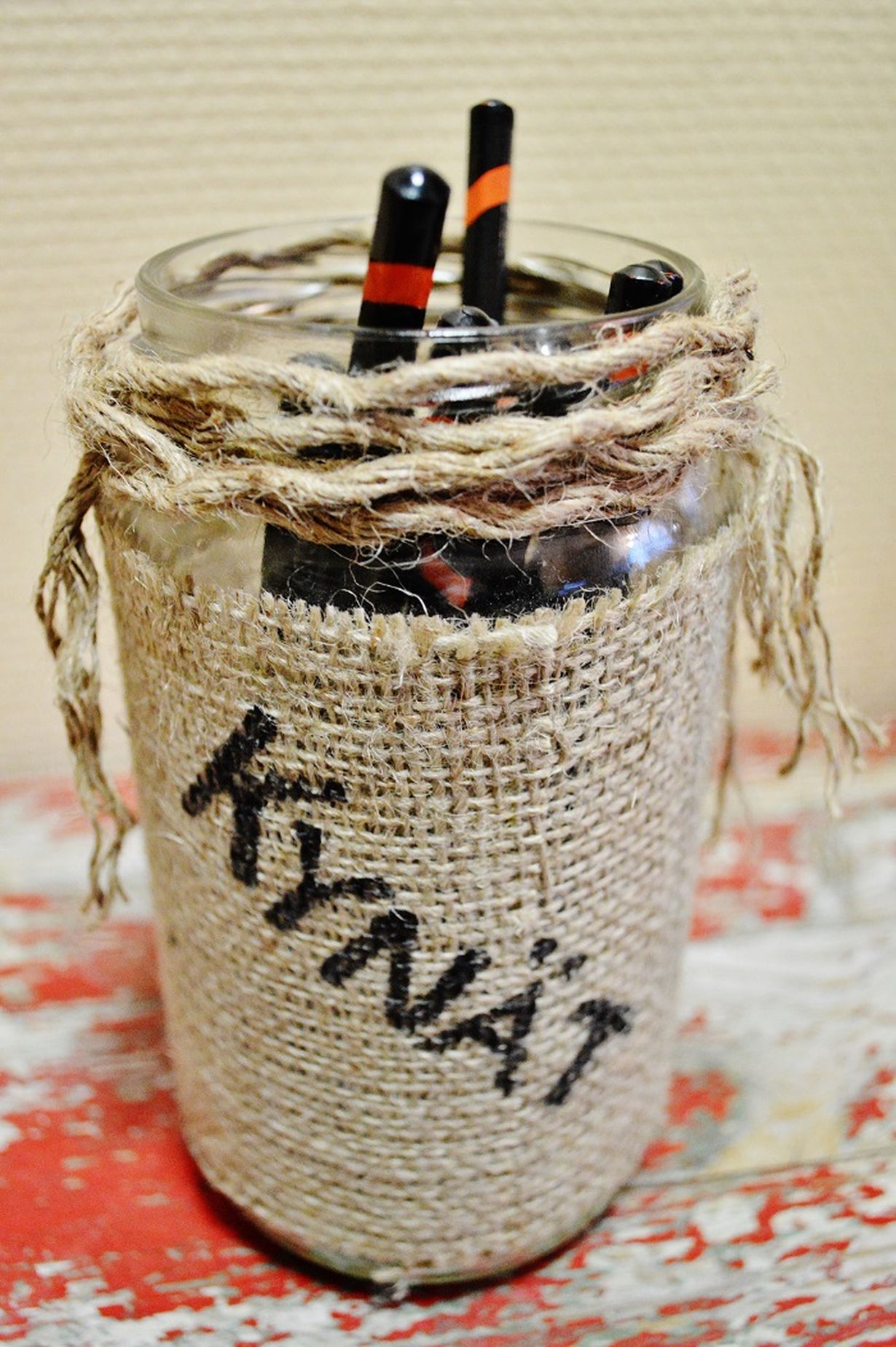 Kierrätys kunniaan! Lasipurkki ja hukkapalat tekevät oivan kynätelineen.
