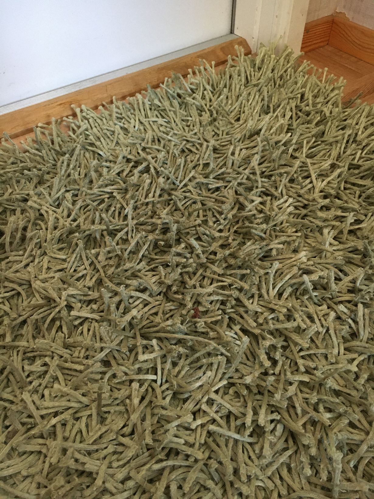 Tämä aikoinaan kirppikseltä ostettu pieni nukkamatto on tuulikaapissamme kynnysmattona. Ihan paras matto. Kurat jäävät nukkaan ja helppo ravistella ulkona. Sitäpaitsi perheemme lempiväriä, ihanan vihreä.