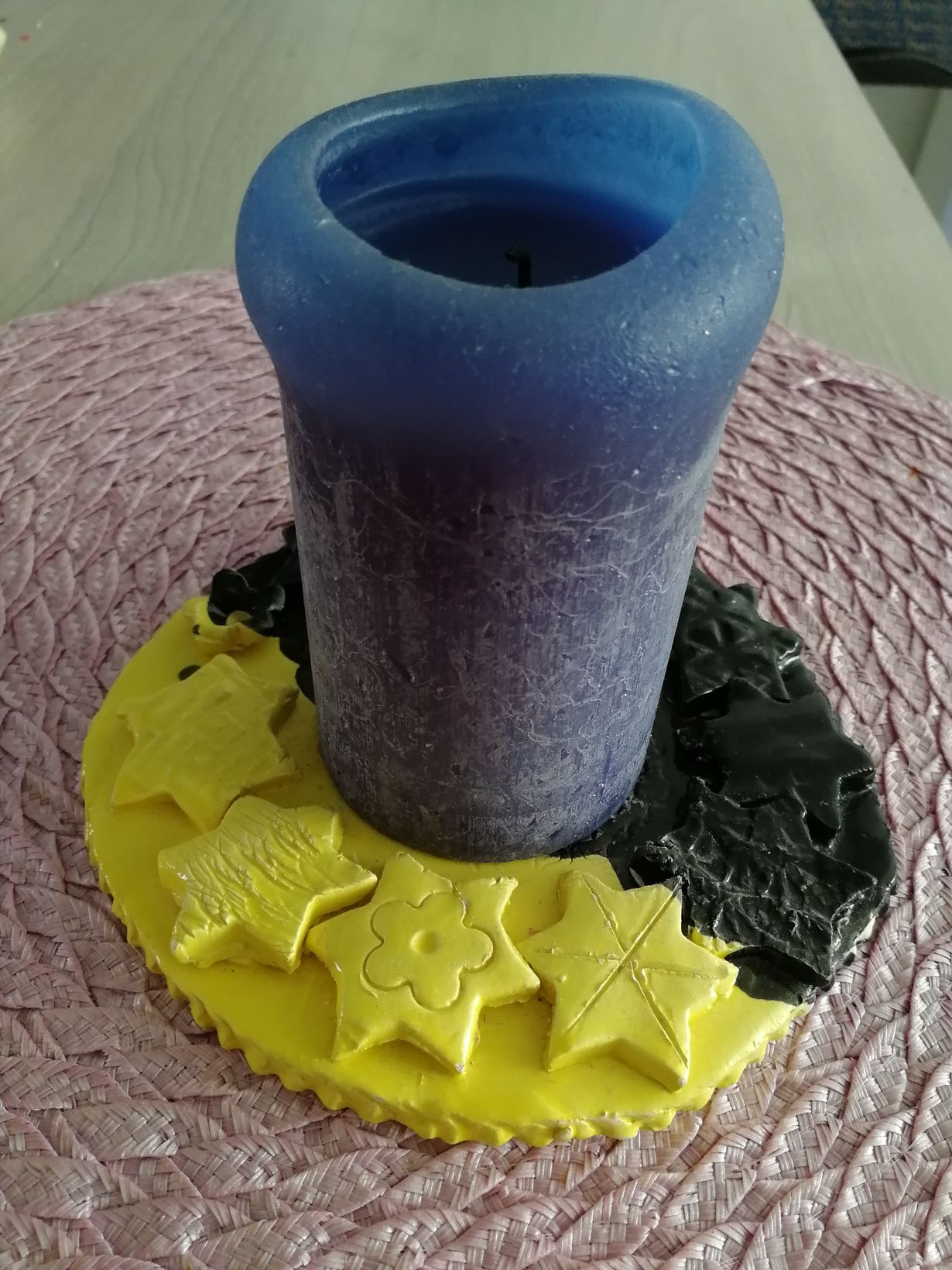 Viime vuonna 9-vuotias tyttäreni aloitti kansalaisopistossa savenmuotoilukurssin ja teki minulle joululahjaksi kynttiläalustan käyttäen lasitteisiin minun lempivärejäni mustaa ja keltaista. Tytär myös piilotti sen kotiin tuotuaan ja paketoikin jouluksi kuusen alle. Aivan paras joululahja ja suosikkisisustusesineeni!