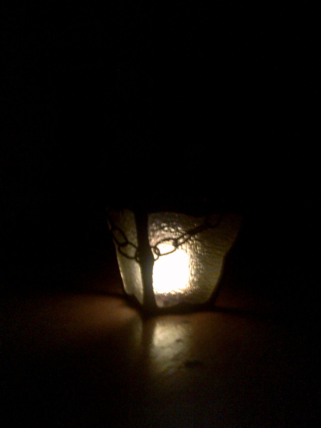 Mökillämme ei ole sähköjä. Talvella siellä käydessämme lyhty luo tunnelmaa verannalla. Lyhty näkyy myös tupaan ja toimii näin yövalona. Kattoripustukseen tarkoitettu kettinki sopii koristeeksi, koska lyhty on pöydällä. Mökki on Kouvolassa.