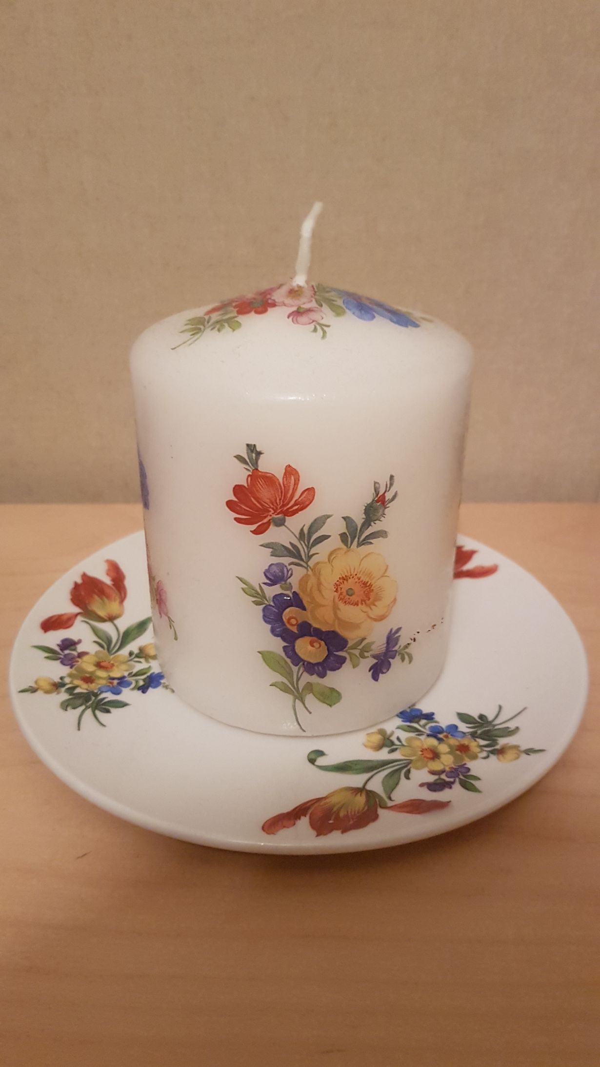 Ystäväni tekemät kynttilä ja lautanen ovat niin kauniita ettei kyntilää malta polttaa, aikanaan kuitenkin posliinilautanen sentään jää muistoksi!