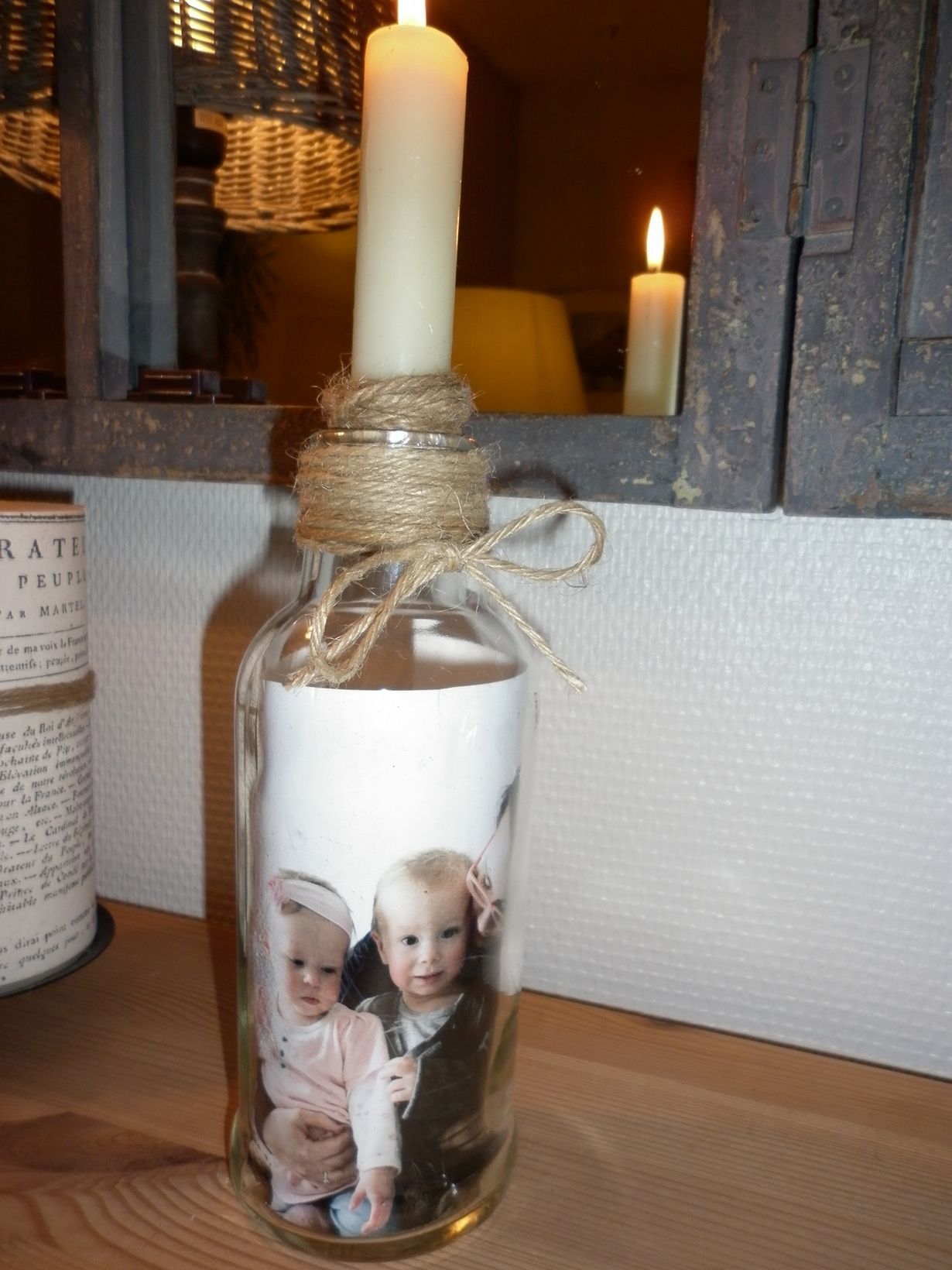 Sanotaan että joku on niin suloinen että tekisi mieli pistää pulloon ja näin tein, söpöt lastenlasten kasvot ilahduttaa pullonsisältä ja samalla pullo toimii kynttiänjalkana.