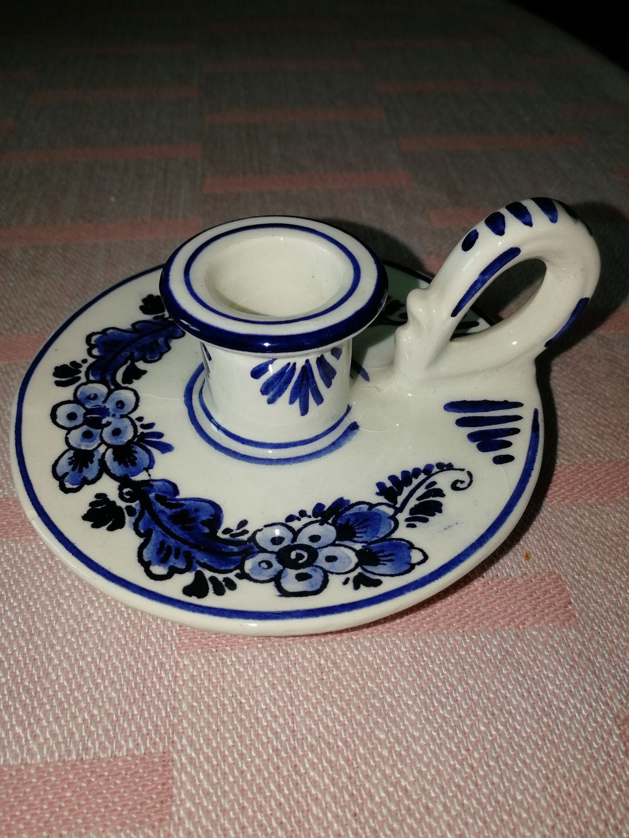 Olin juuri jäänyt äitiyslomalle 1984 ja aikaa tuntui olevan, etsin kirjeenvaihtokaveria ja löysin Mariannen Hollannista. Vuosien kuluessa tutustuimme toistemme elämään kirjeiden kautta ja lähettelimme pieniä lahjojakin, tämän kynttilänjalan sain häneltä Delftistä. Elämä vei molempia vauhdilla ja kirjeenvaihto loppui, mutta kynttilänjalka jäi.