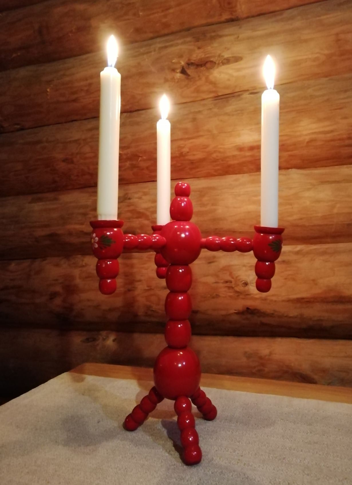 Tämä kynttelikkö on kuulunut jouluuni lapsuudesta asti. Samoja kruunukynttilöitä poltettiin useampana jouluna, kunnes jäljellä oli vain kellastuneet pätkät. Nyt kynttelikkö valaisee mökkijouluamme.