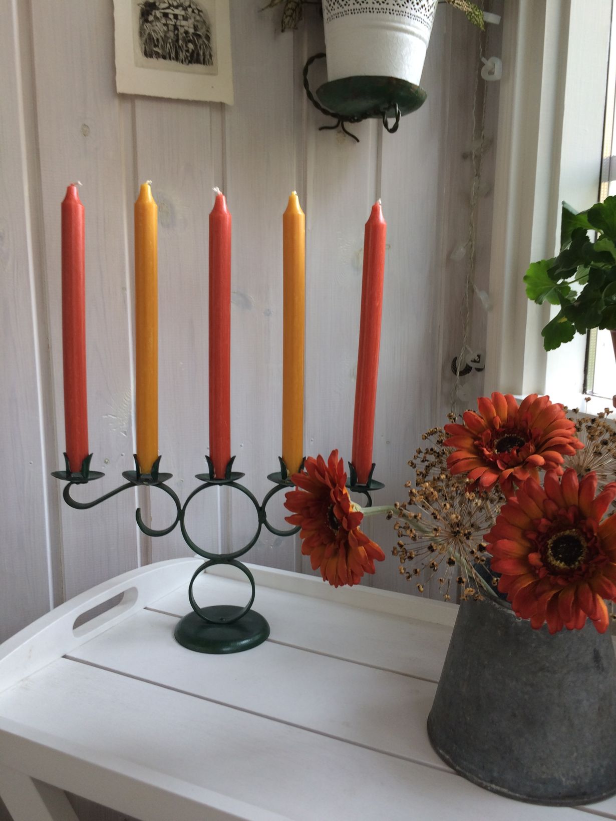 Löysin kynttilänjalan vuosia sitten Rauman kesäiseltä iltatorilta, hinta vain 2€. Se herätti muistoja lapsuudestani; tädilläni, jonka luona vietin usein aikaa, oli samanlainen keittiössään. Omassa kodissa paikka ja kynttilät vaihtuu tunnelman mukaan.