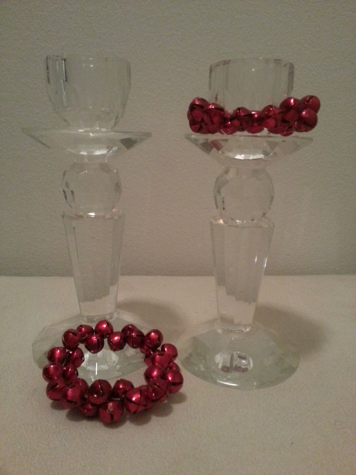 Ostin nämä kaksi kristallista kynttilänjalkaa Prahan matkaltani viitisen vuotta sitten. Jouluna "puen" kynttilänjalkoihin itse askartelemani punaiset metallikulkus-mansetit. Nämä ovat ainoat mitkä koristavat juhlakattauksiamme.