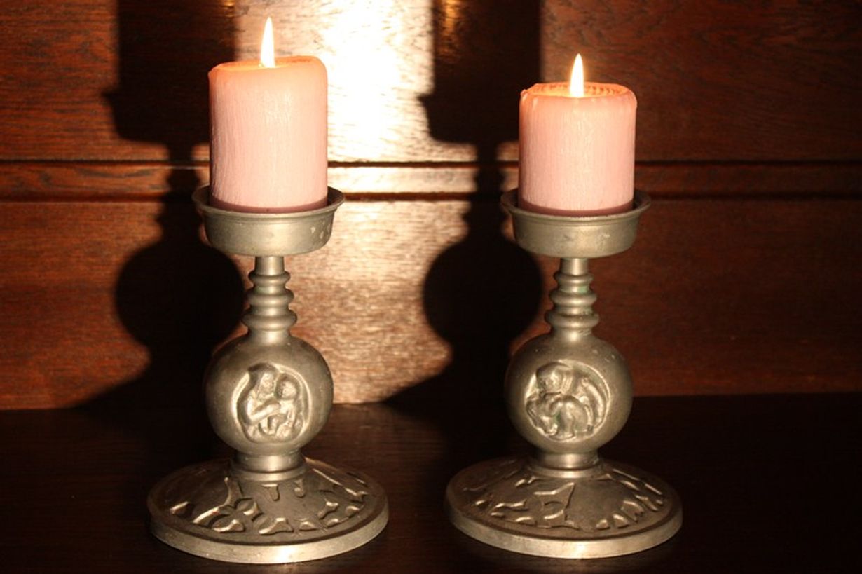 Nämä uniikit kynttilänjalat ovat löytö kirpputorilta. Niiden alkuperästä ei ole tietoa. Kynttiläosassa oli keskellä tappi, joka olisi halkaissut kynttilän – apuun tuli aina auttavainen naapuri, joka työpajassaan poisti tapit.