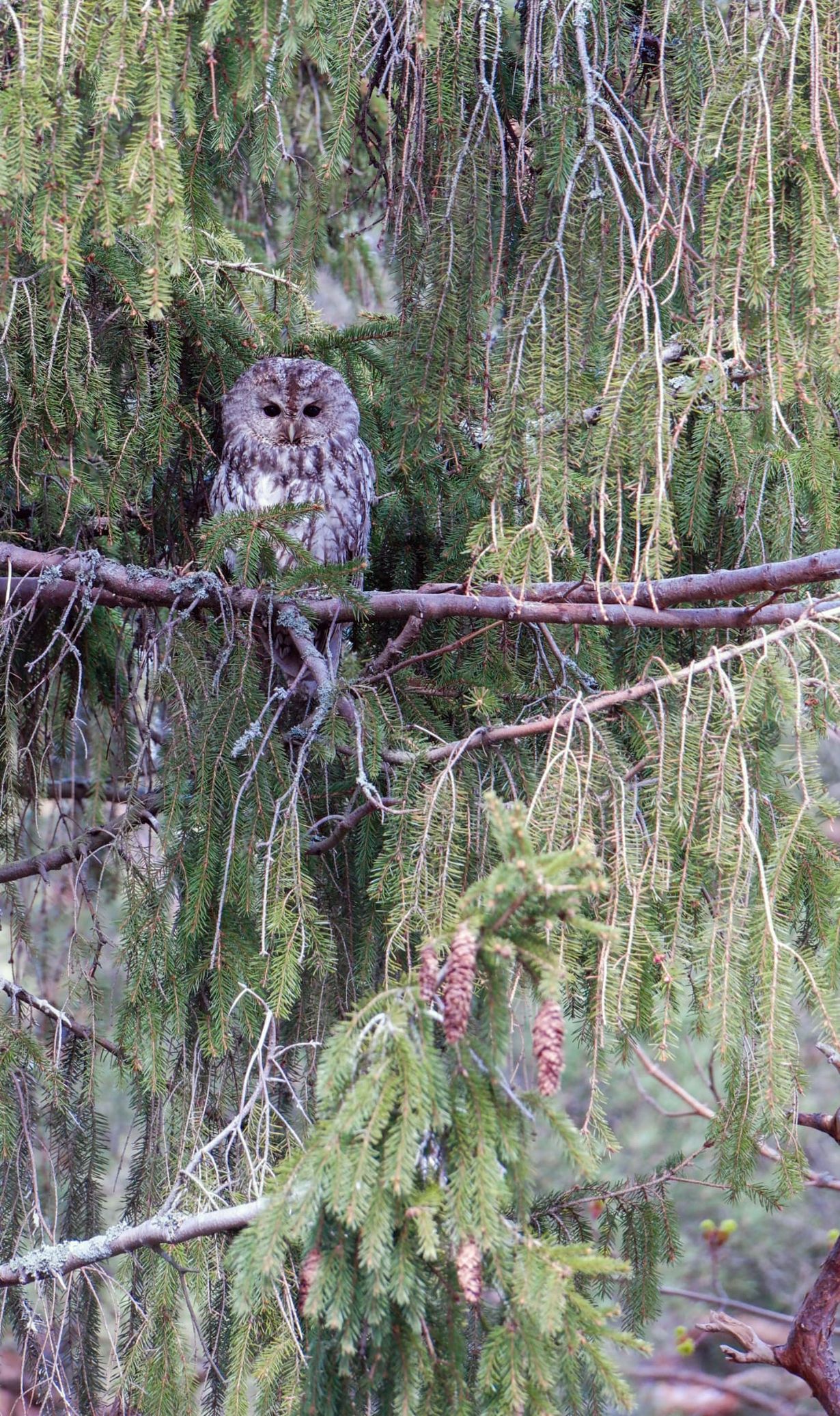 Keittiön ikkunan edessä isossa kuusessa Helsingin Herttoniemessä istuu lehtopöllö. Tulee joskus aamulla ja lähtee illalla. Välillä rastaat hätystelee tätä komistusta. Ei tarvitse lähteä kauemmaksi etsimään aitoa luontoa.