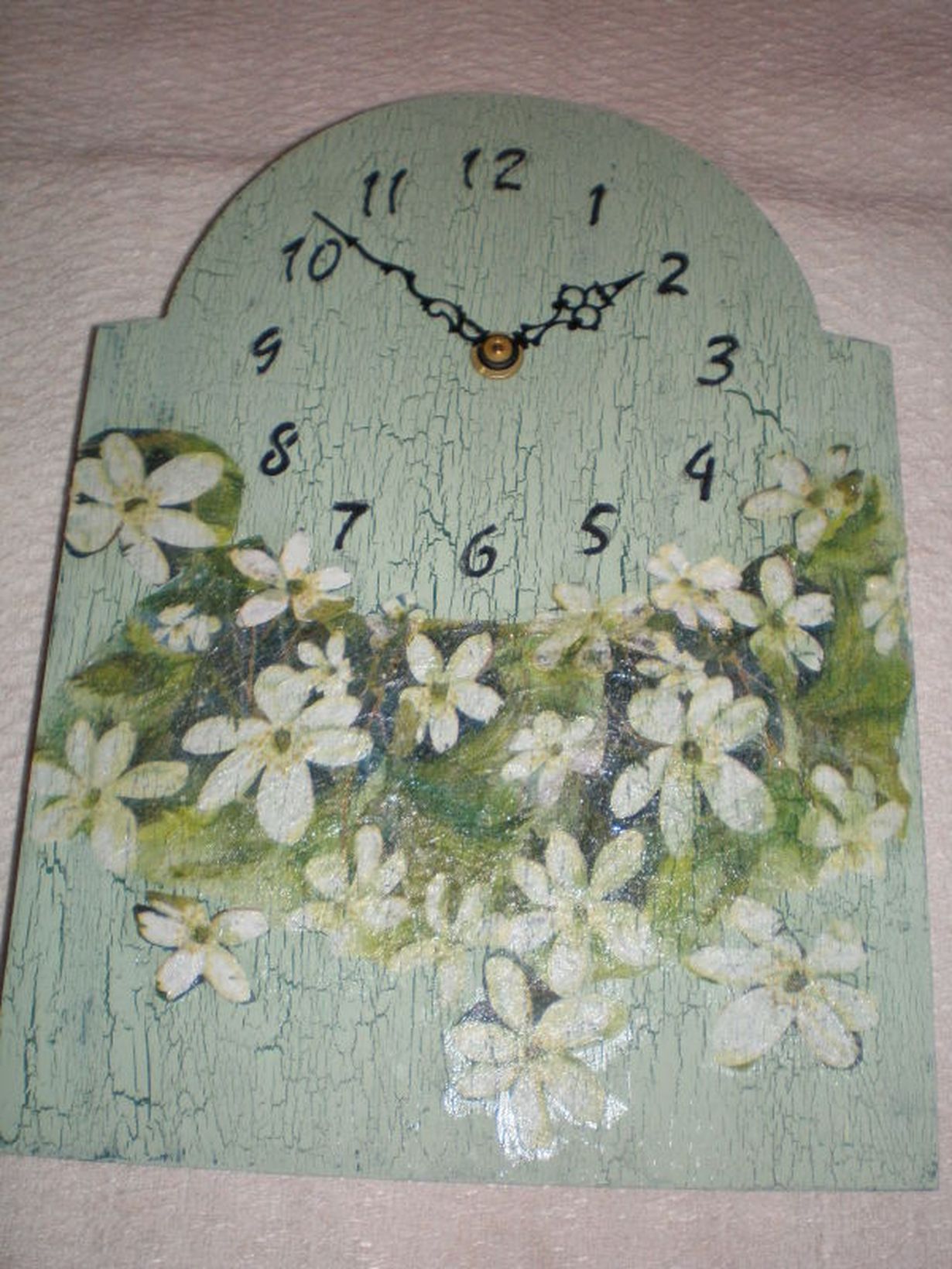 Olin sisustamassa omaa pientä huonettani. Ihastuin sisareni valmistamaan kauniiseen kelloteokseen.Hän huomasi ihailuni ja lahjoitti sen minulle. Omaperäinen ja minulle sopiva.