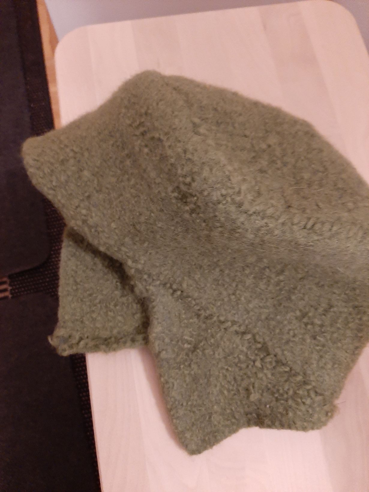 Sisko ei voinut ohittaa kaunista huovutettavaa neulelankaa, vaikkei väri hänelle käynytkään. Niinpä minä sain vihreän huovutetun pipon.