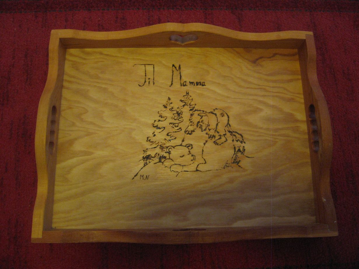 Tyttäreni teki tämän tarjottimen minulle yläasteella joululahjaksi.Tarjotin on minulla keittiössä näkyvällä paikalla ja tekee minut iloiseksi kun sitä katson ja käytän:) Hän soitti isälleen päivällä ja sanoi, että tulla hakemaan hänet koulusta, hänellä on niin iso kantaminen kotiin, se oli lahjaksi saamani tarjotin.