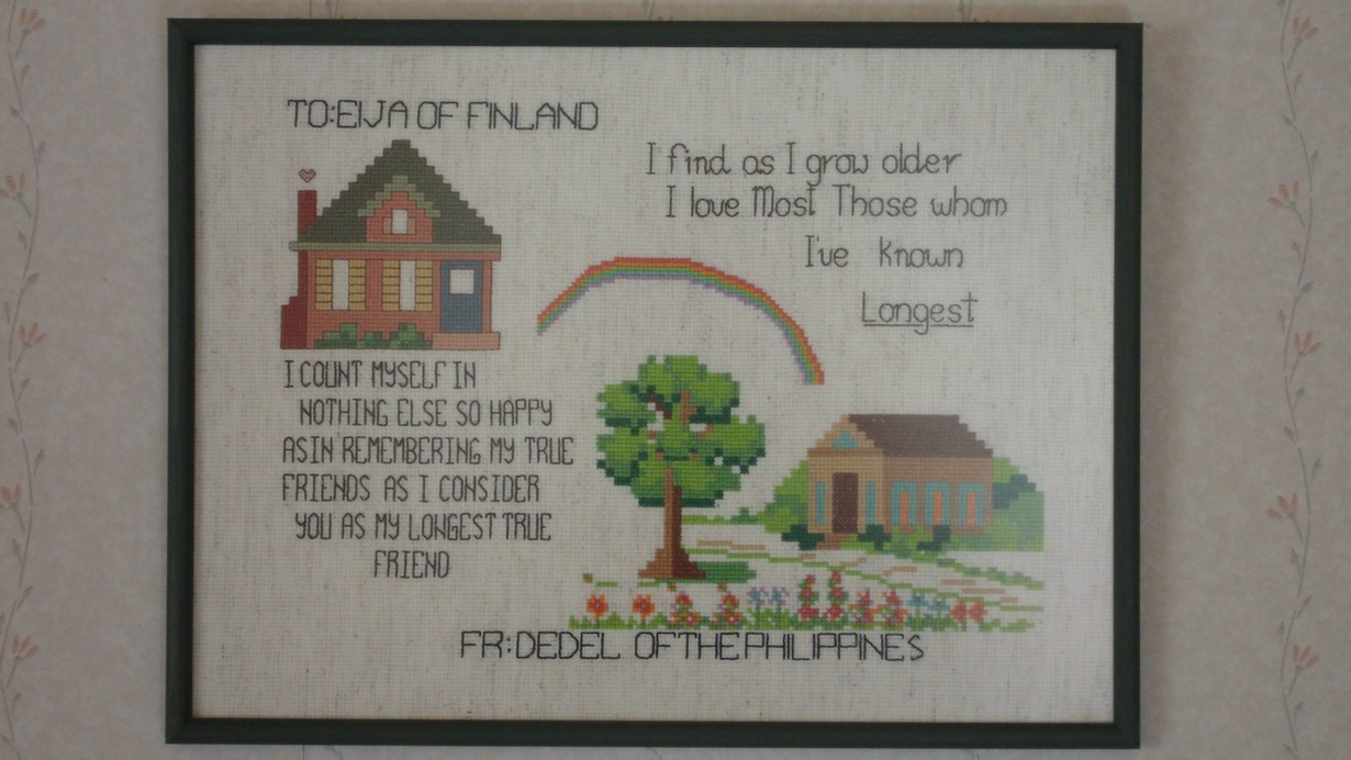 Sain taulun lahjaksi Filippiiniläiseltä kirjeystävältäni vuosia sitten. Hän on sen itse tehnyt. Ystävyytemme on kestänyt jo yli 40 vuotta.