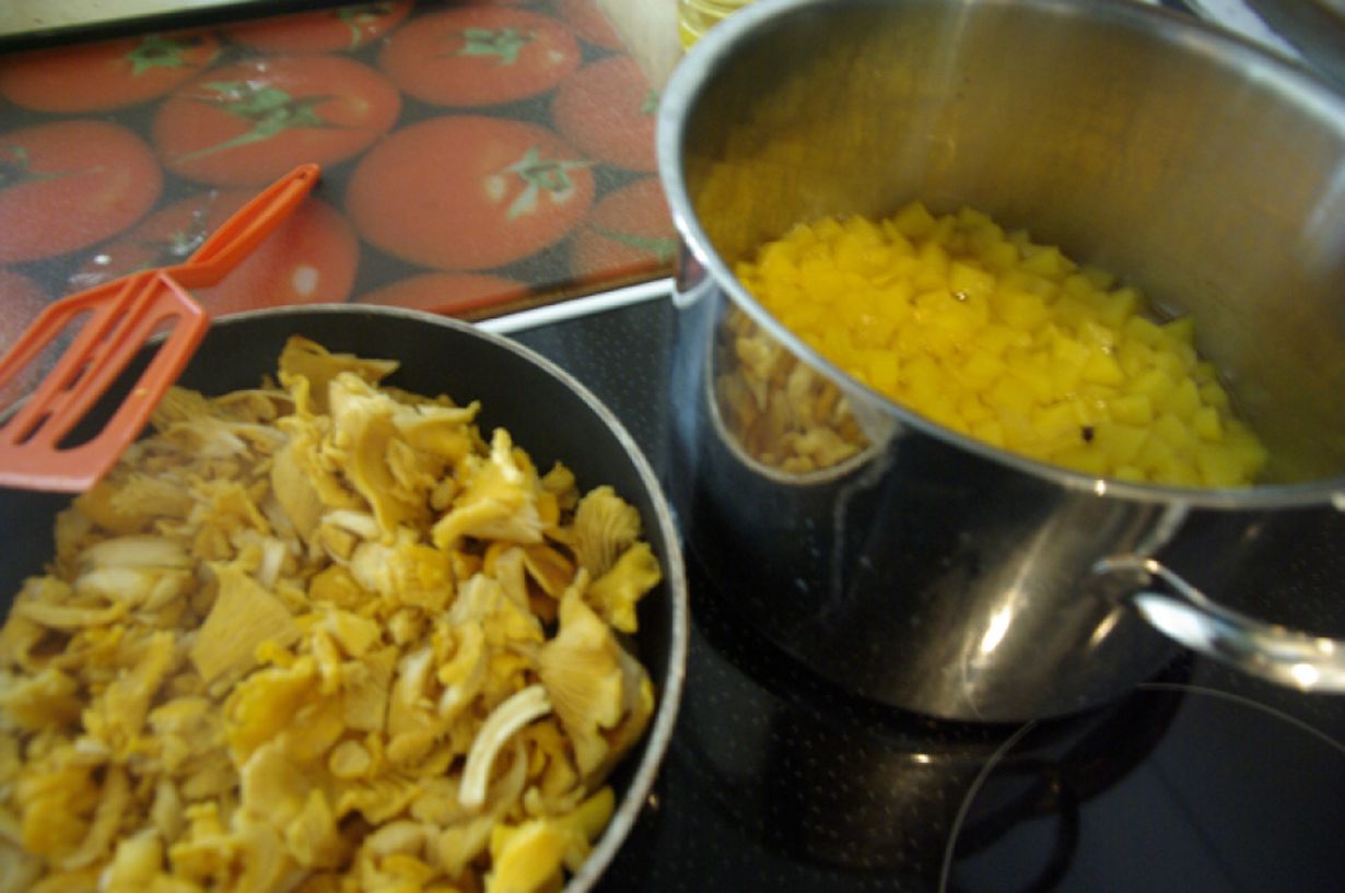 Kattilassa kiehuu naapurin antamaa kurpitsaa pikkelsiksi. Kattila on aivan tavallinen teräksinen ja viisi litraa vetävä. Sain kyseisen kattilan Kiteen ortodoksiselta Tiistaiseuralta, kodinsiunauksen yhteydessä 2006. Kuvassa myös kantarelleja paistinpannulla.