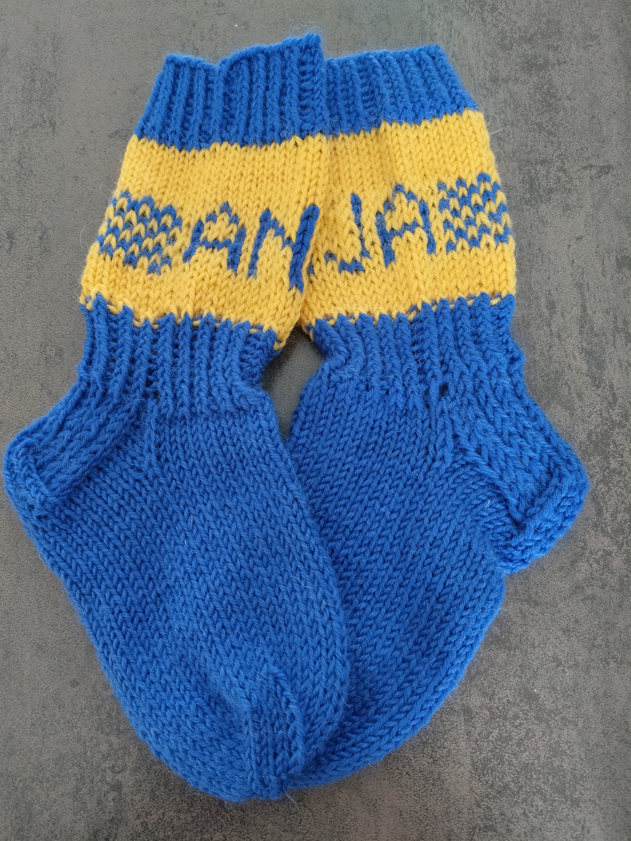 Synttärilahjaksi 7-v Anjalle, joka ikävöi kotiin Harkovaan. Heti hänen saavuttua Suomeen neuloin hänelle raitasukat, joissa sattumalta keltainen ja sininenkin raita. Niistä tuli hänen lempisukat. Nyt hän sai nimikkosukat kotimaan lipun värein